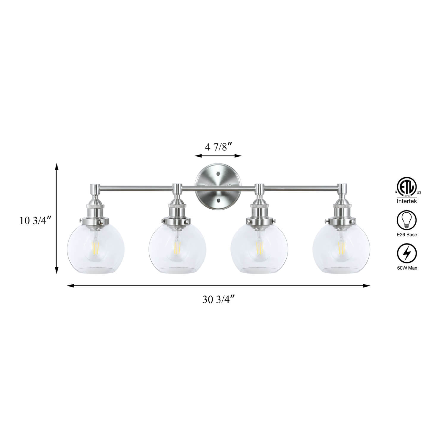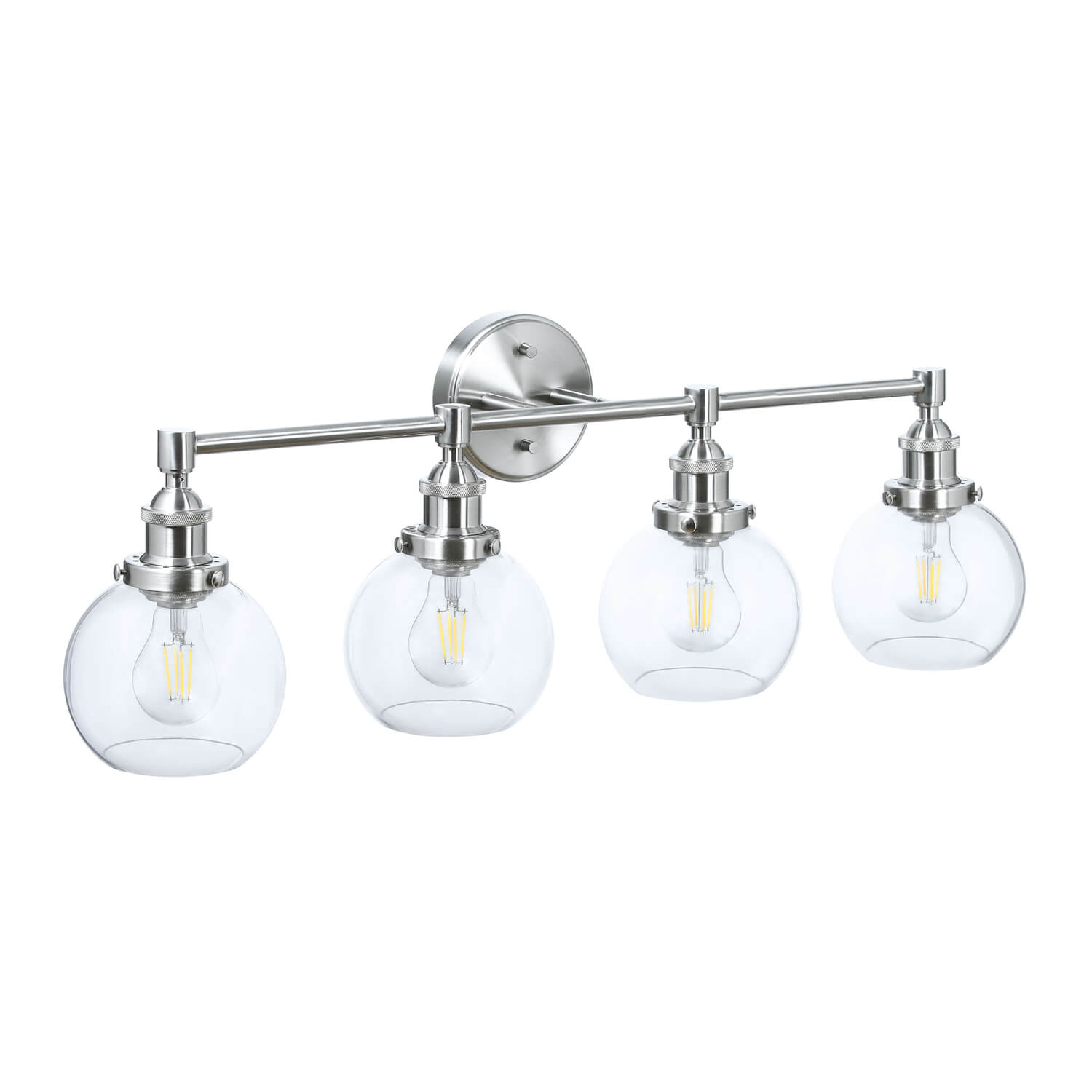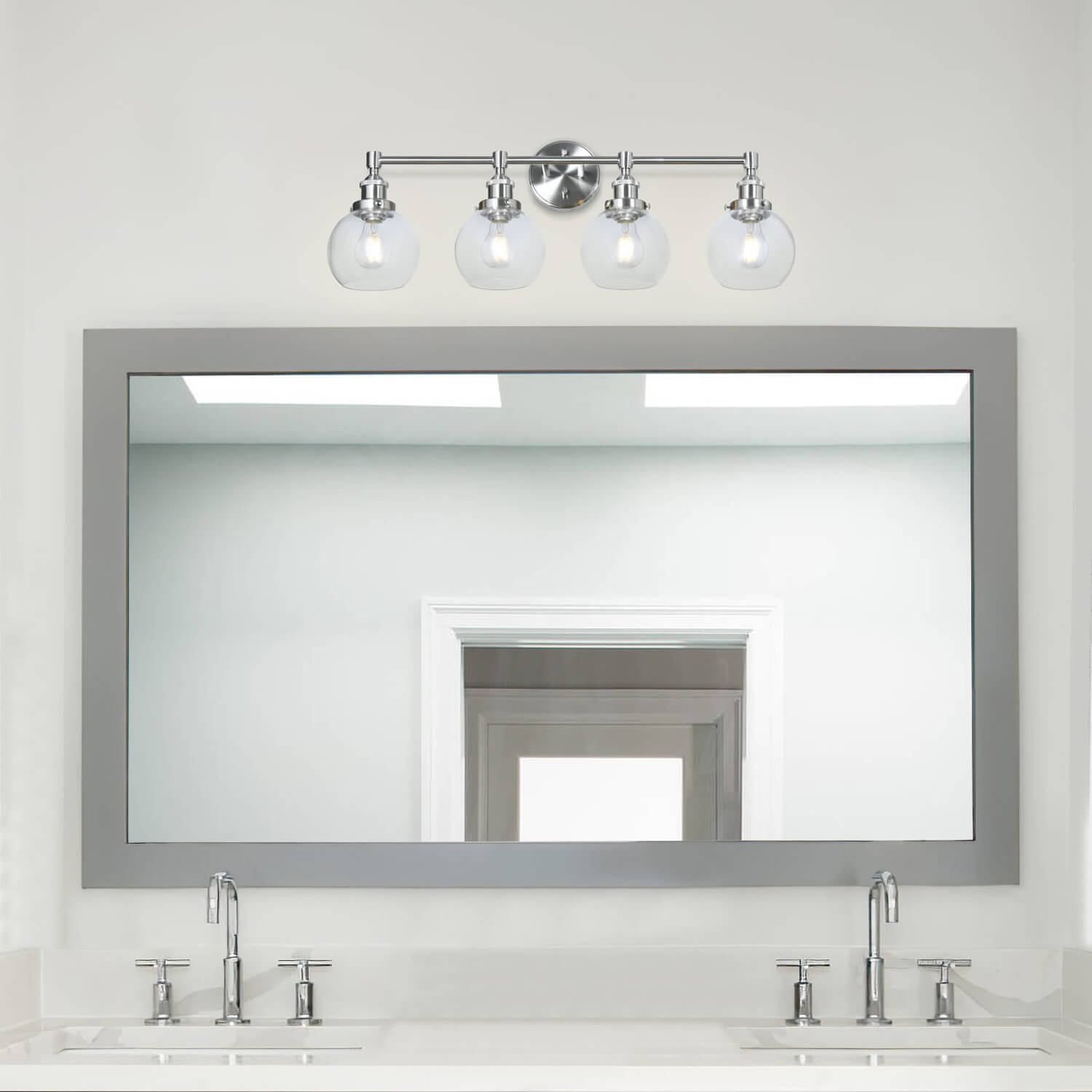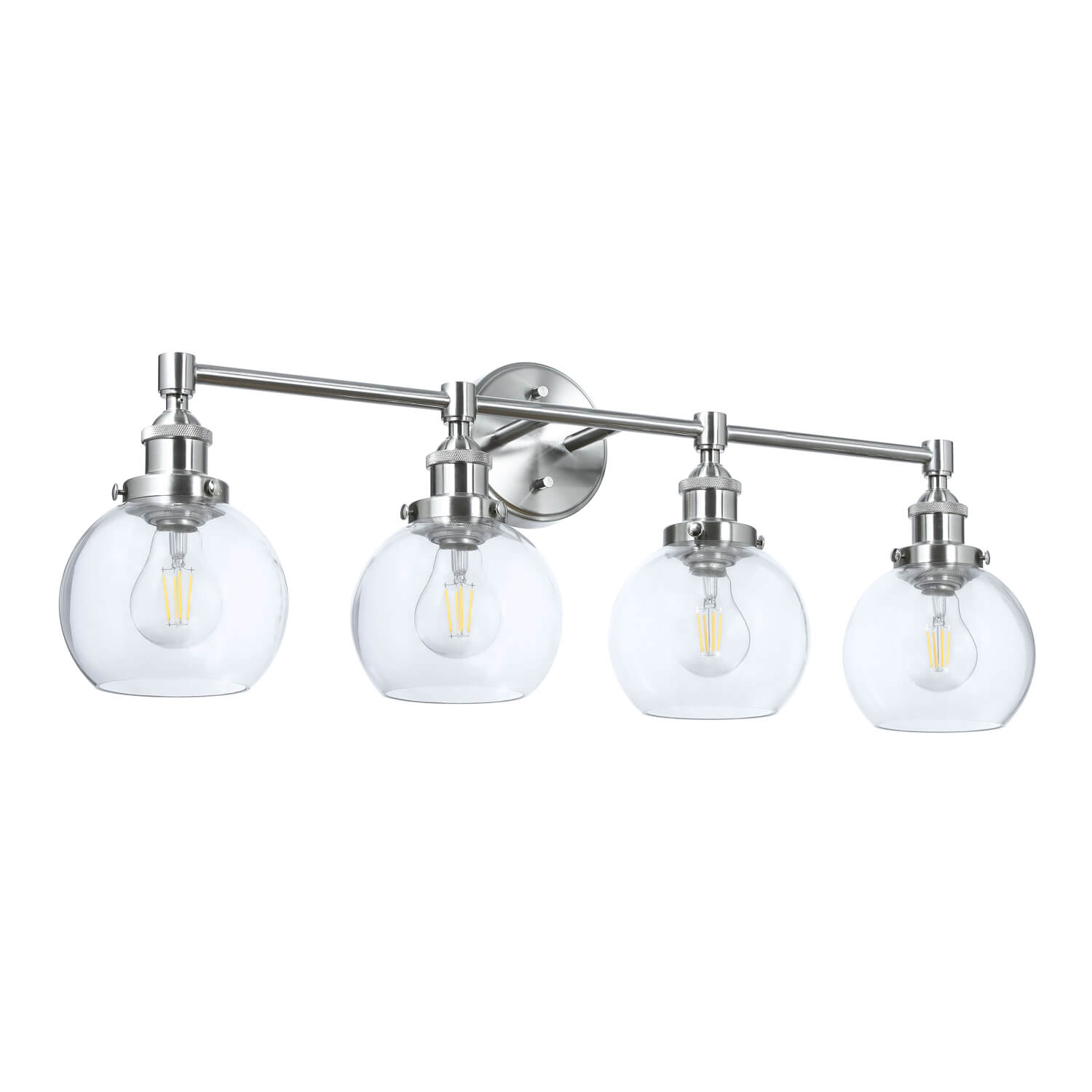 - VINTAGE DESIGN: This 4 light bathroom vanity light fixtures is equipped with clear glass globe shades that showcase the bulb your choose. And this bathroom light fixture also ideal for over mirror or bed, a doorway or entryway, lining an office or hotel hallway.