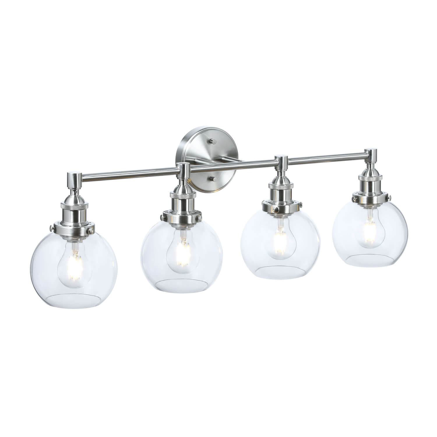 This 4 Light bathroom vanity light fixtures feature a clear, spherical shade paired with vintage style metal fittings in stylish brushed nickel finishes.