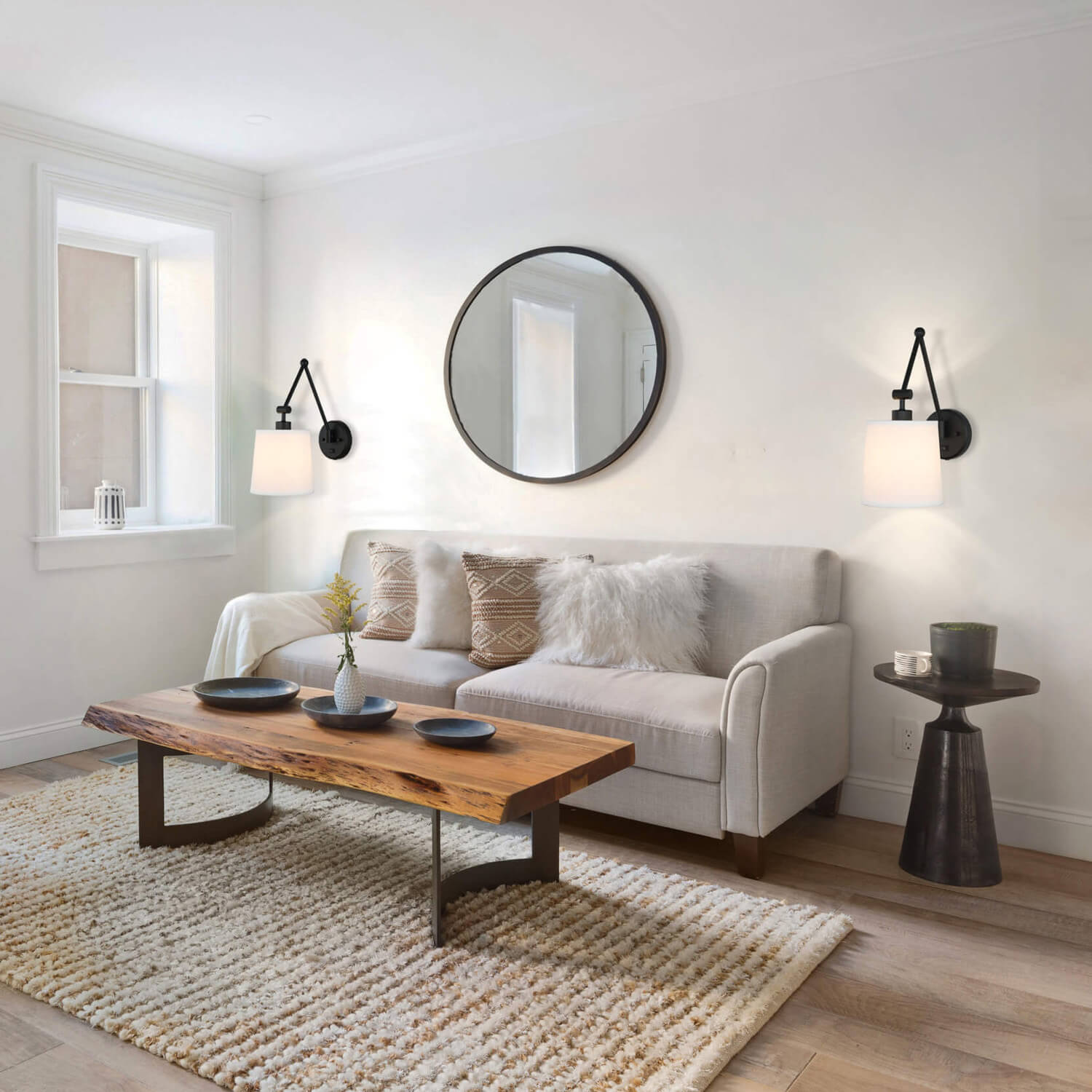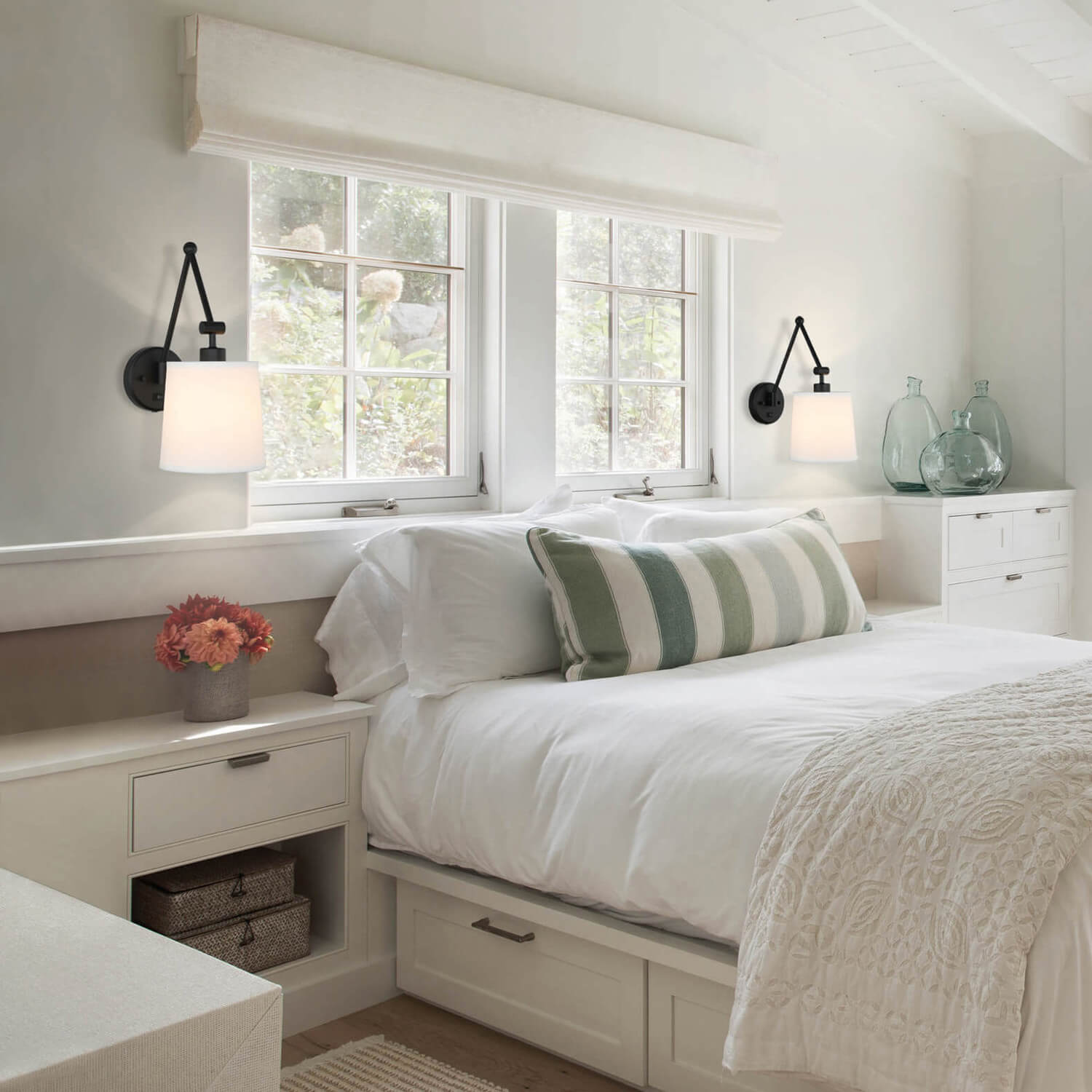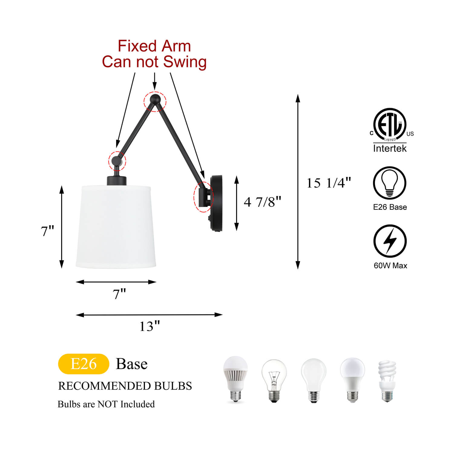 - MODERN DESIGN: 1 light bedroom wall mounted light with flared shape of white fabric shade with its unique curved arm design shows the modern look and warm lighting. Suitable for any space: Kitchen, Dining room, Bedroom, Reading room, Living room, Cafe bar, Club, Hotel, Warehouse, Hallway and etc.