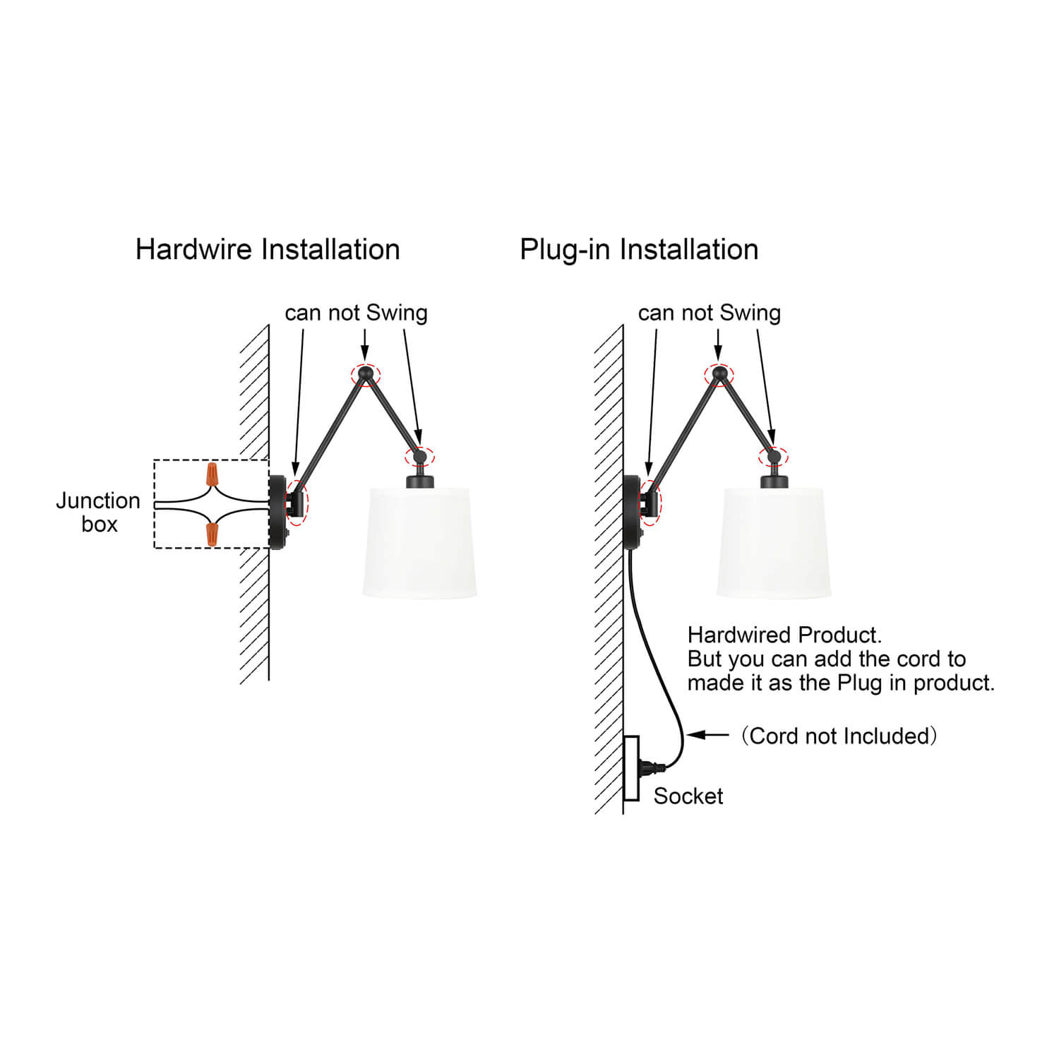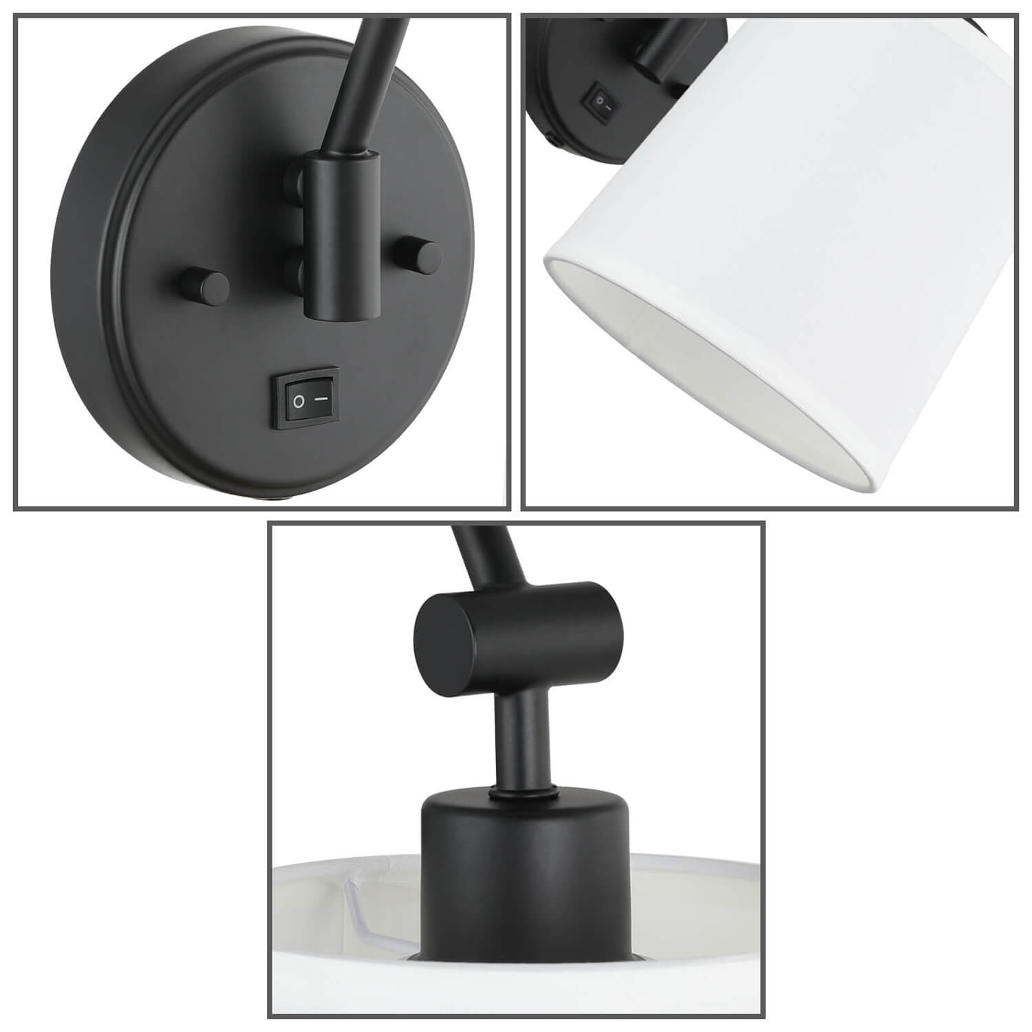 - FEATURE: Hardwired, Matte Black finish over metal frame. This wall lamp is with white fabric shade; industrial wall light is with simple design and easy to install; Rocker On-Off switch on backplate gives you easy lighting control.
