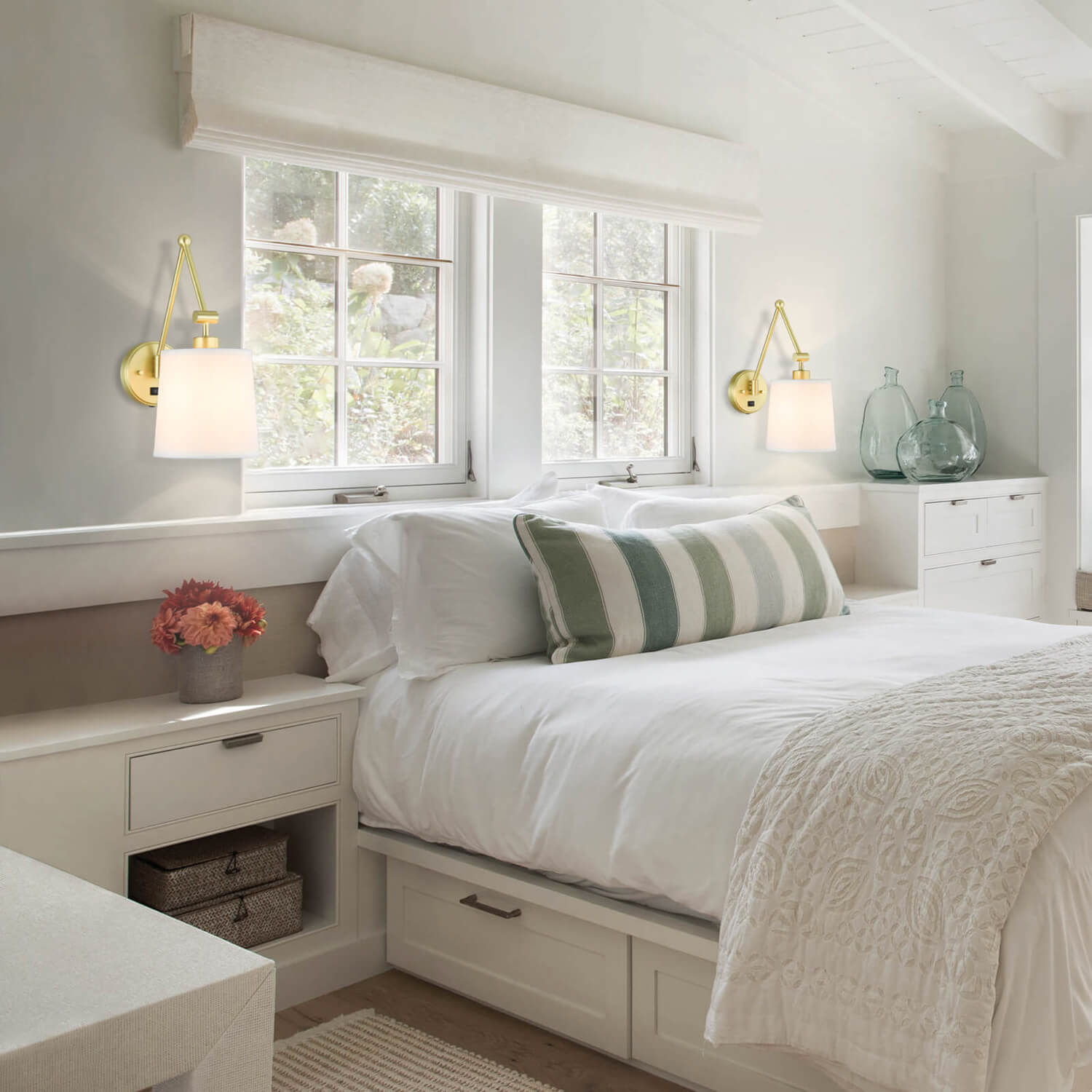 - MODERN DESIGN: 1 light bedroom wall mounted light with flared shape of white fabric shade with its unique curved arm design shows the modern look and warm lighting. Suitable for any space: Kitchen, Dining room, Bedroom, Reading room, Living room, Cafe bar, Club, Hotel, Warehouse, Hallway and etc.