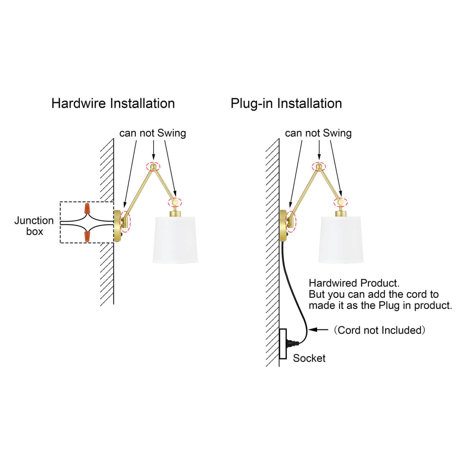 - FEATURE: Hardwired, Matte Black finish over metal frame. This wall lamp is with white fabric shade; industrial wall light is with simple design and easy to install; Rocker On-Off switch on backplate gives you easy lighting control.