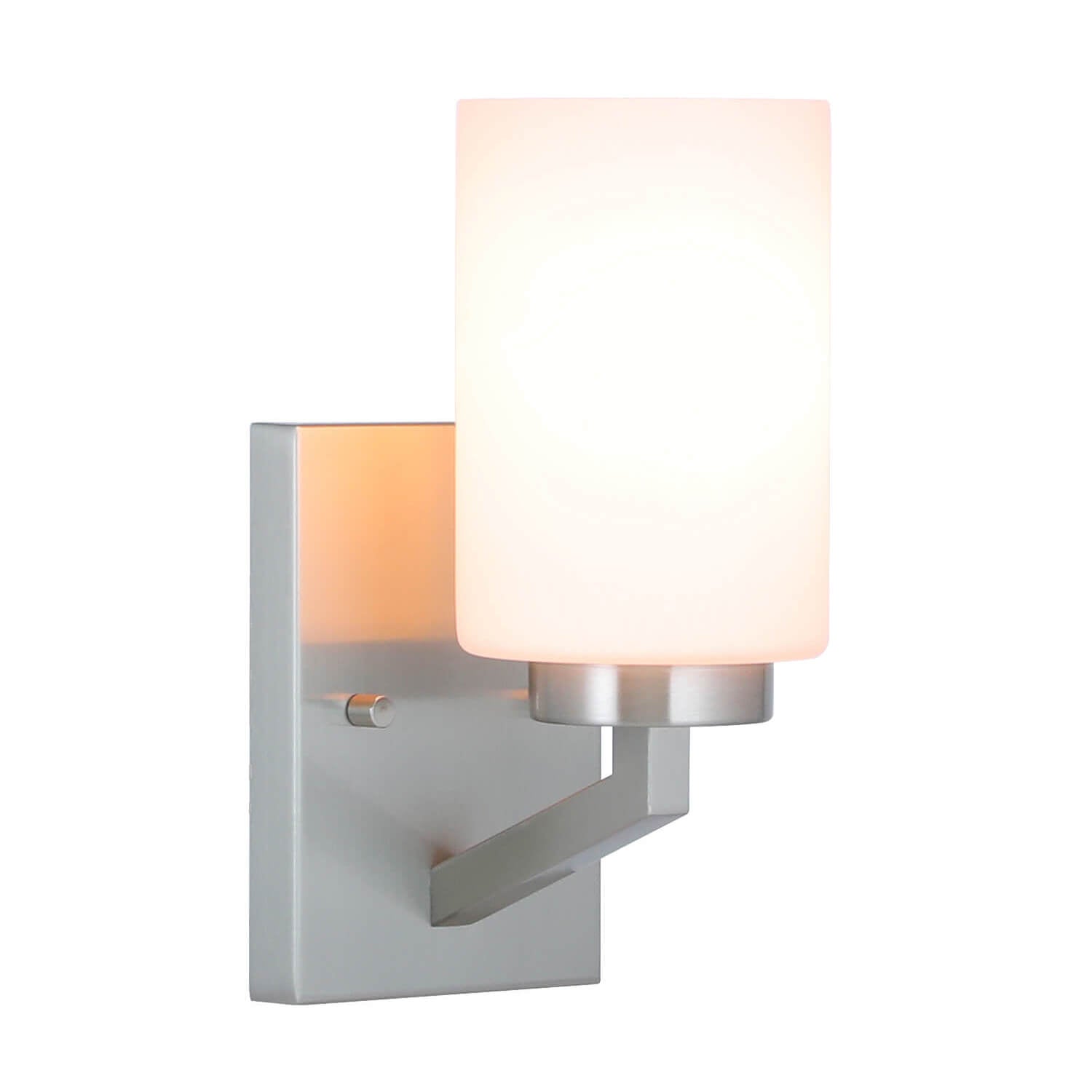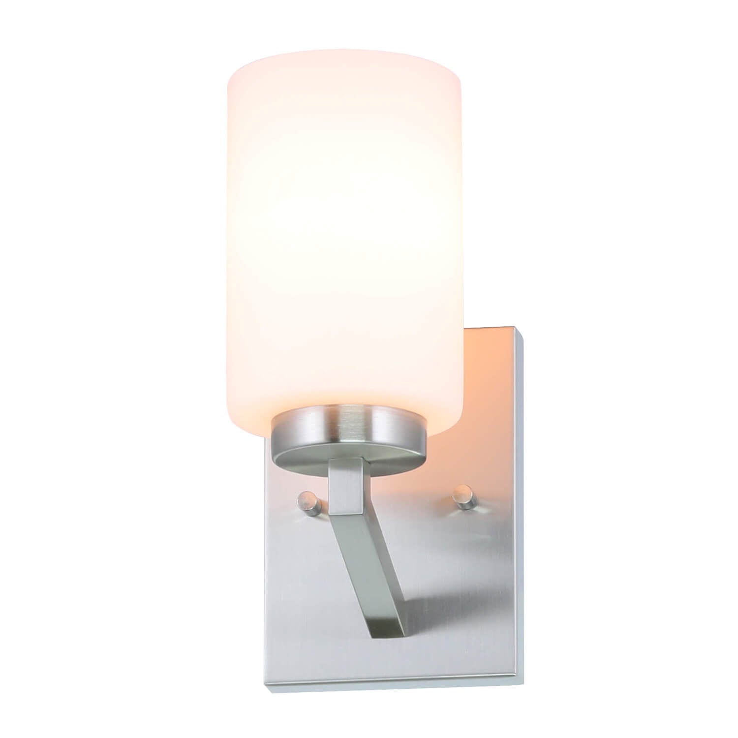 • FEATURE: Hardwired. Bathroom Vanity Light with cylindrical white glass shade elegantly rests on the metal light base as it exudes a quiet confidence ready to illuminate any tired mind or body in need a restorative glow