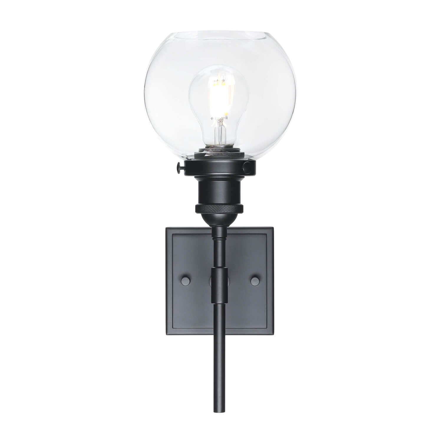 This 1 light black wall light features a clear, spherical shade paired with modern-style metal fittings in a matte black finish.