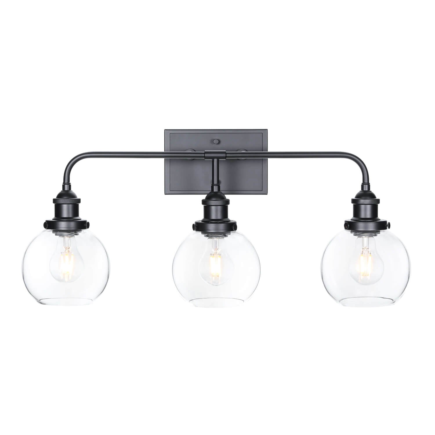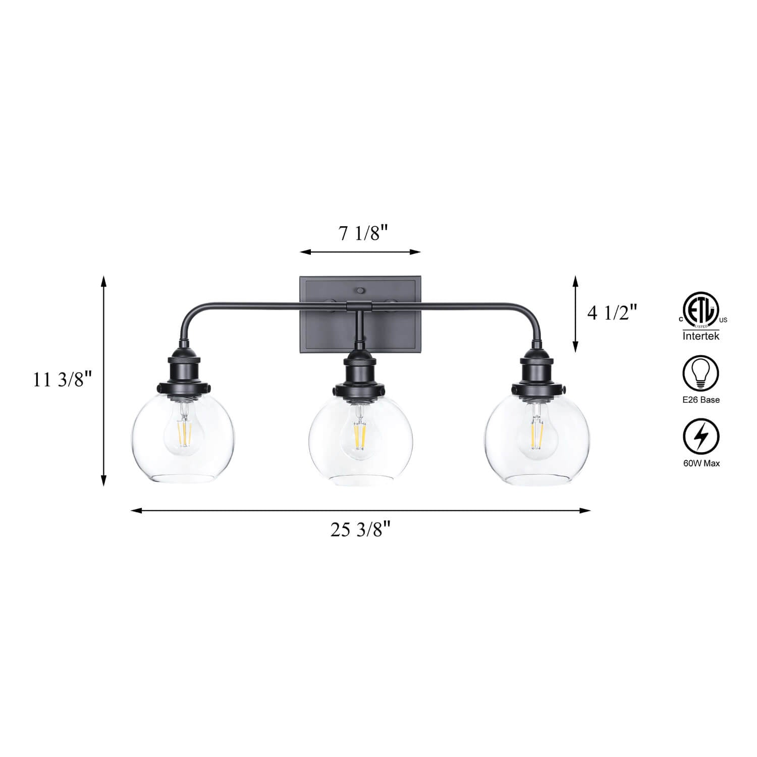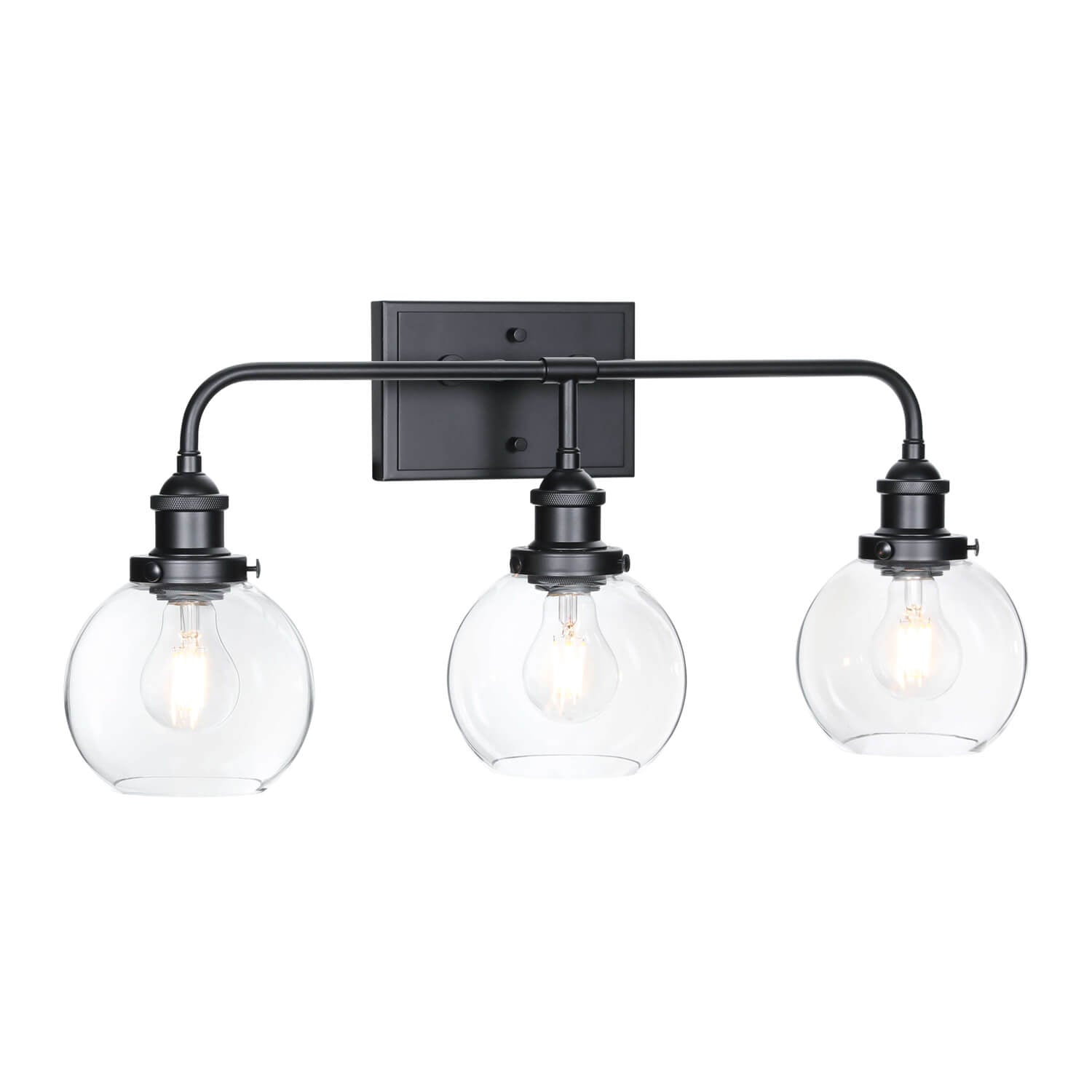 - MODERN DESIGN: Hardwired. This 3 light vanity wall light with duable hardware body in matte black finish and clear spherical glass that features elegance and simplicity of nostalgic styles.