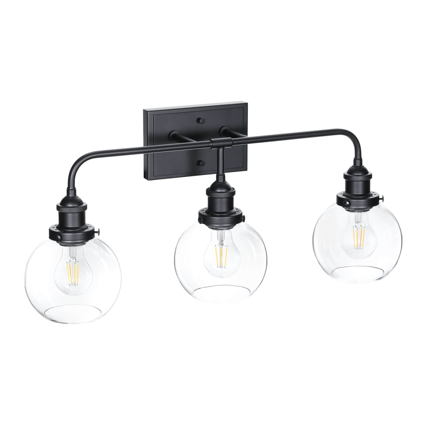 - FEATURE: This bathroom vanity light with clear glass can light up any room. Simple but modern design adds elegant luminance to your living room, dining room, entryway, bedroom or Bathroom. Modern black wall mounted light with glass globe and an iron base recalls industrial streetlamp designs, enhancing your well-styled space easily.
