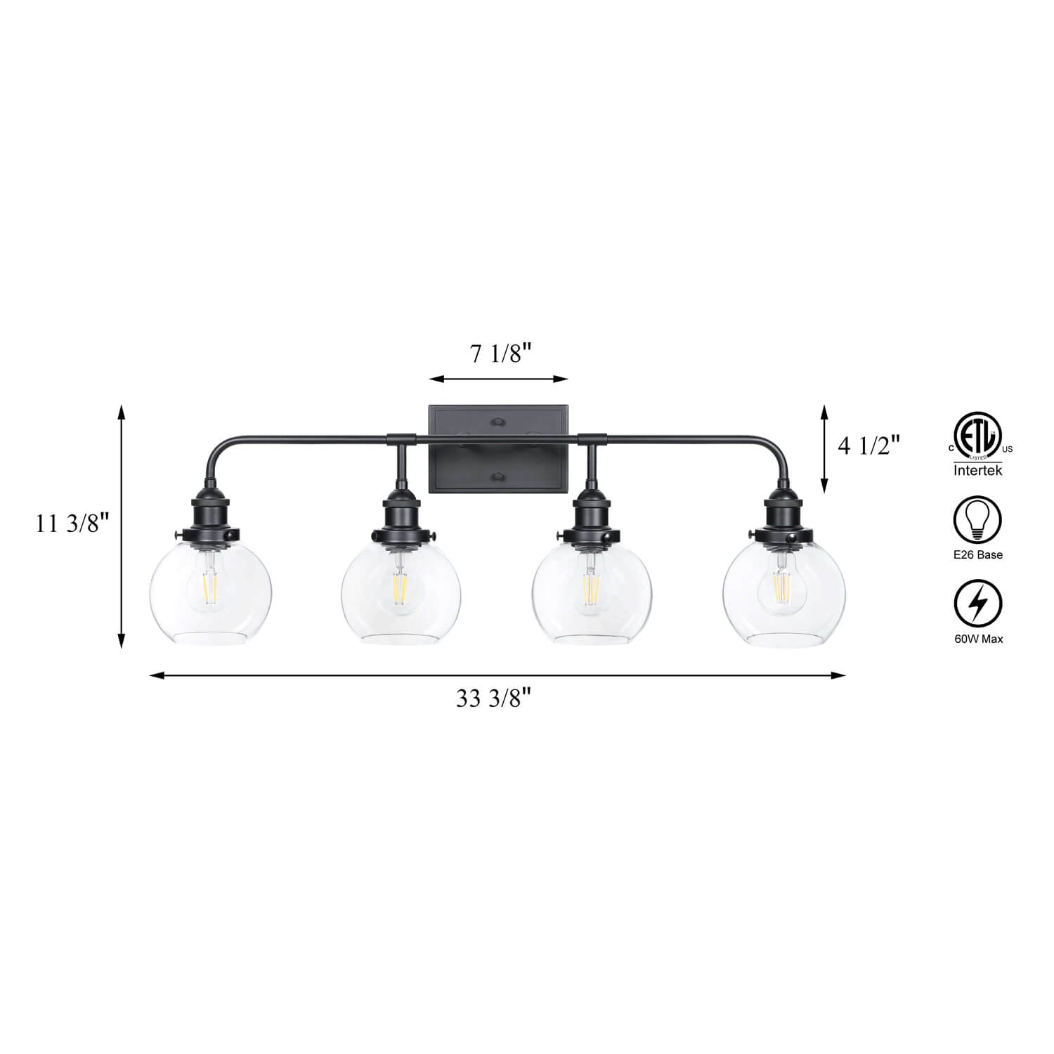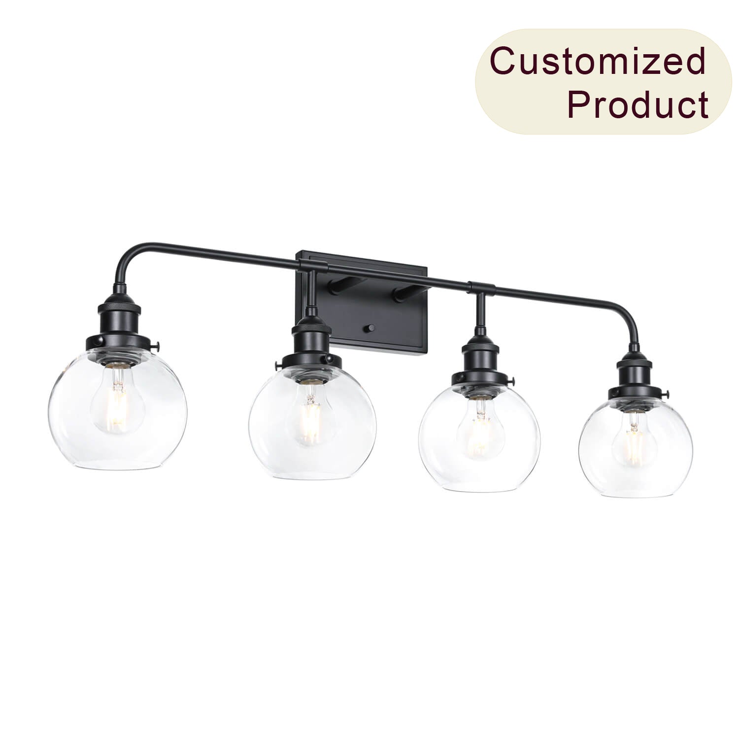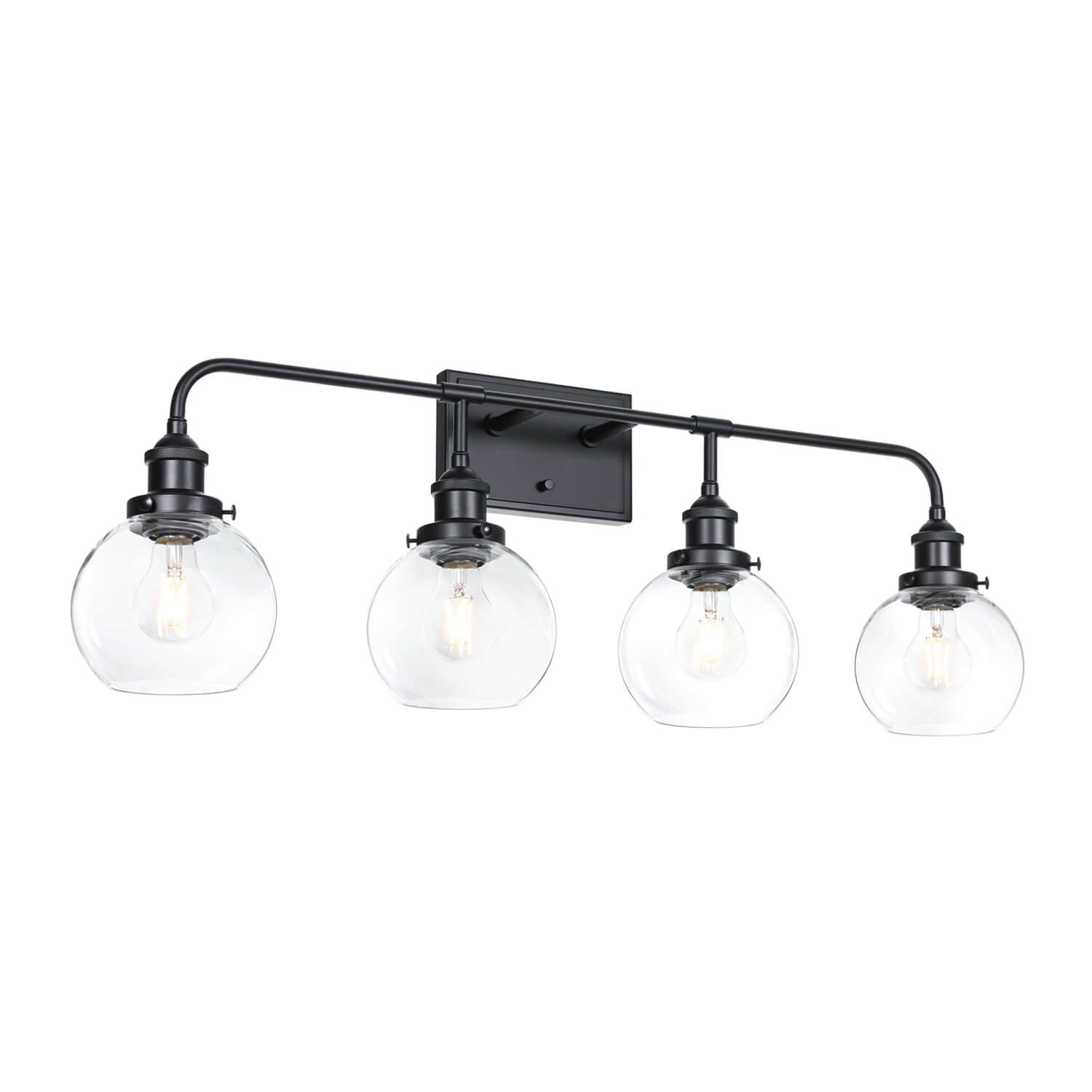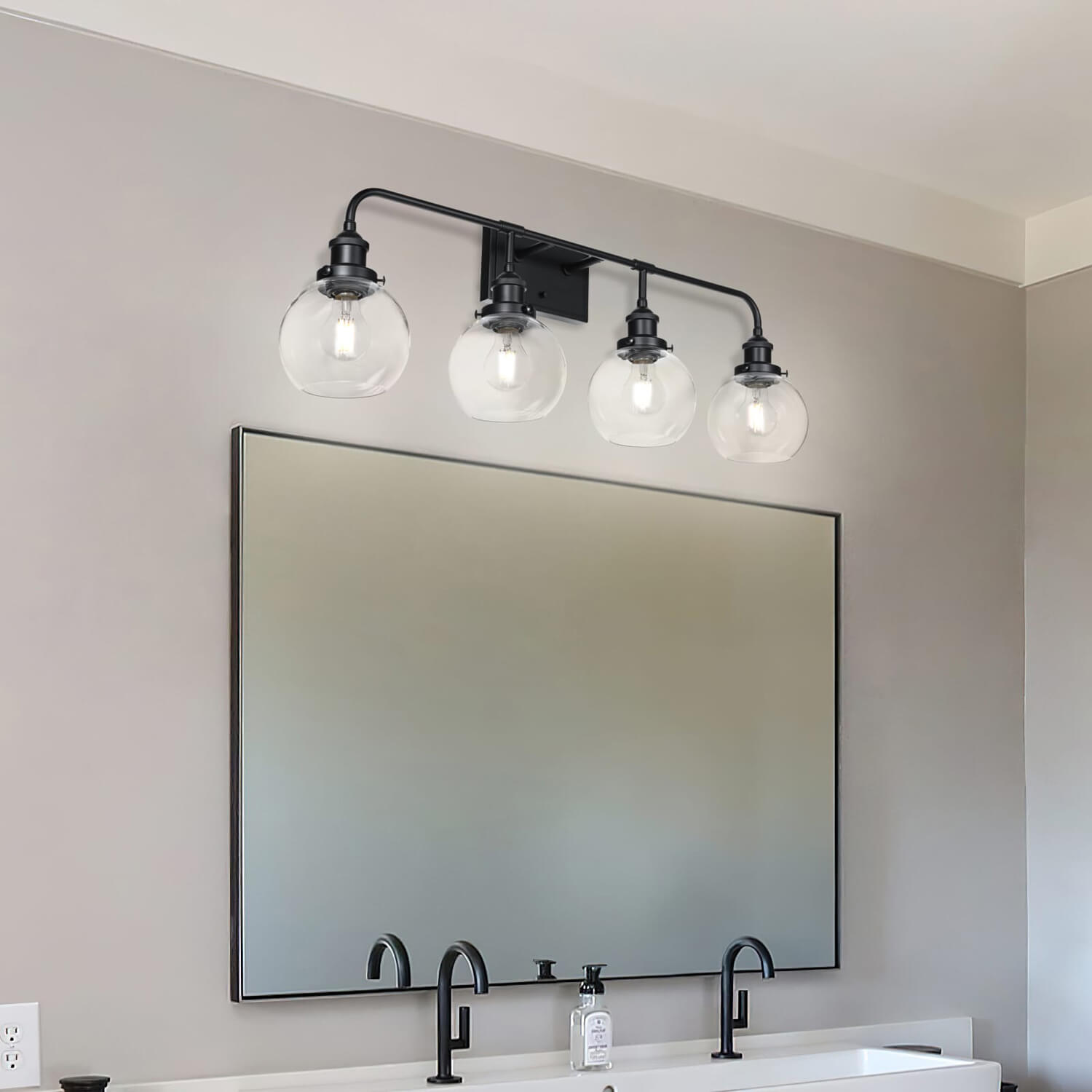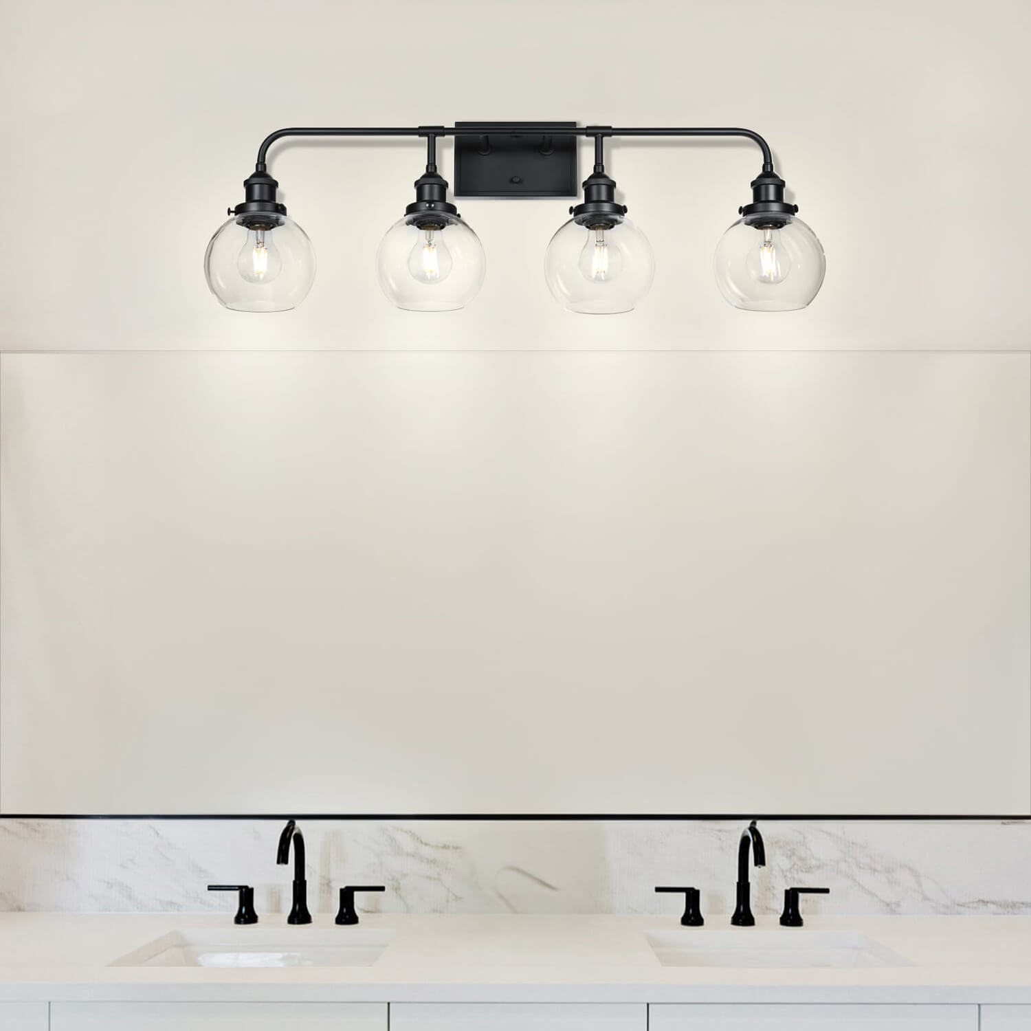 - MODERN DESIGN: Hardwired. This 4 light bathroom vanity light with duable hardware body in matte black finish and clear spherical glass that features elegance and simplicity of nostalgic styles. It can be installed in an upward or downward position to illuminate any area warmly.