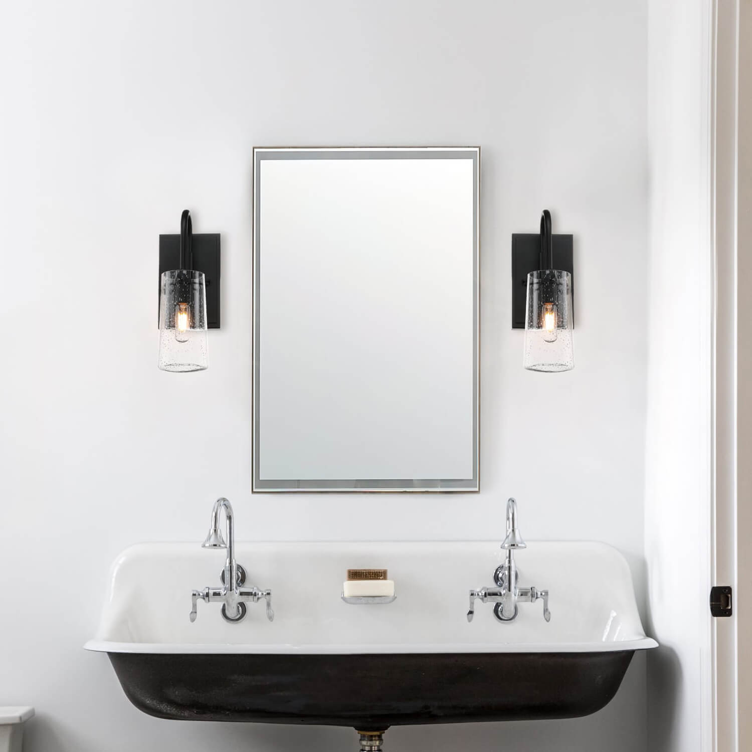 • MODERN DESIGN: Wall sconce in matte black features a goose neck arm and a jar shade clear seeded glass shade created a bright glow to any home. This bathroom wall light fixtures adds a modern farmhouse or industrial decor to your bathroom, bedroom, hallway etc. Increase the retro mood in any space.