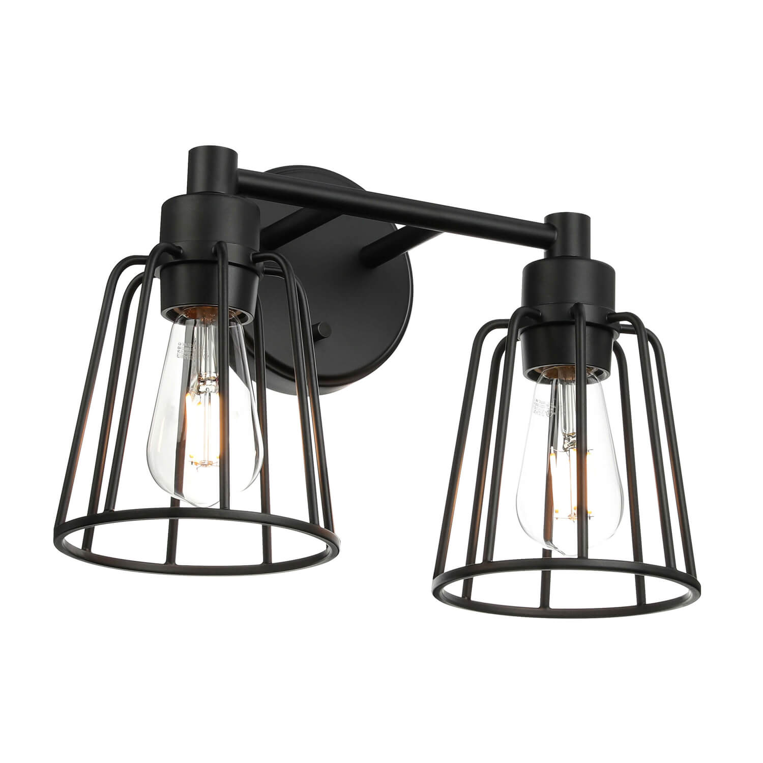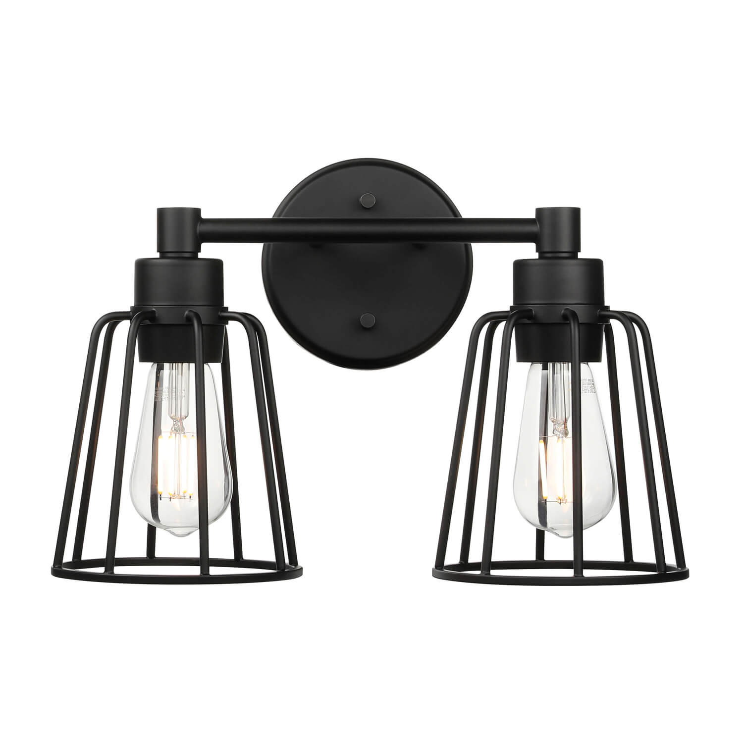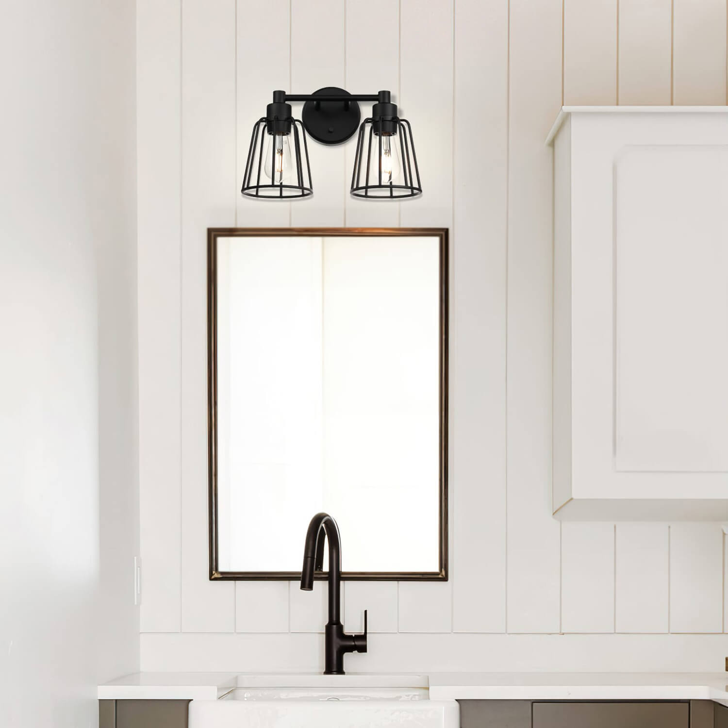 - INDUSTRIAL DESIGN: Sconces wall lighting is with wire cage shade that is made of durable iron. The 2 light cage wall sconce is well-made and carefully packed. Farmhouse black vanity wall light fixture is in a vintage industrial, simple, classic and traditional design that is well protects the bulb and maximizes its light and evoking with every element you need for creating a retro-industrial style environment.