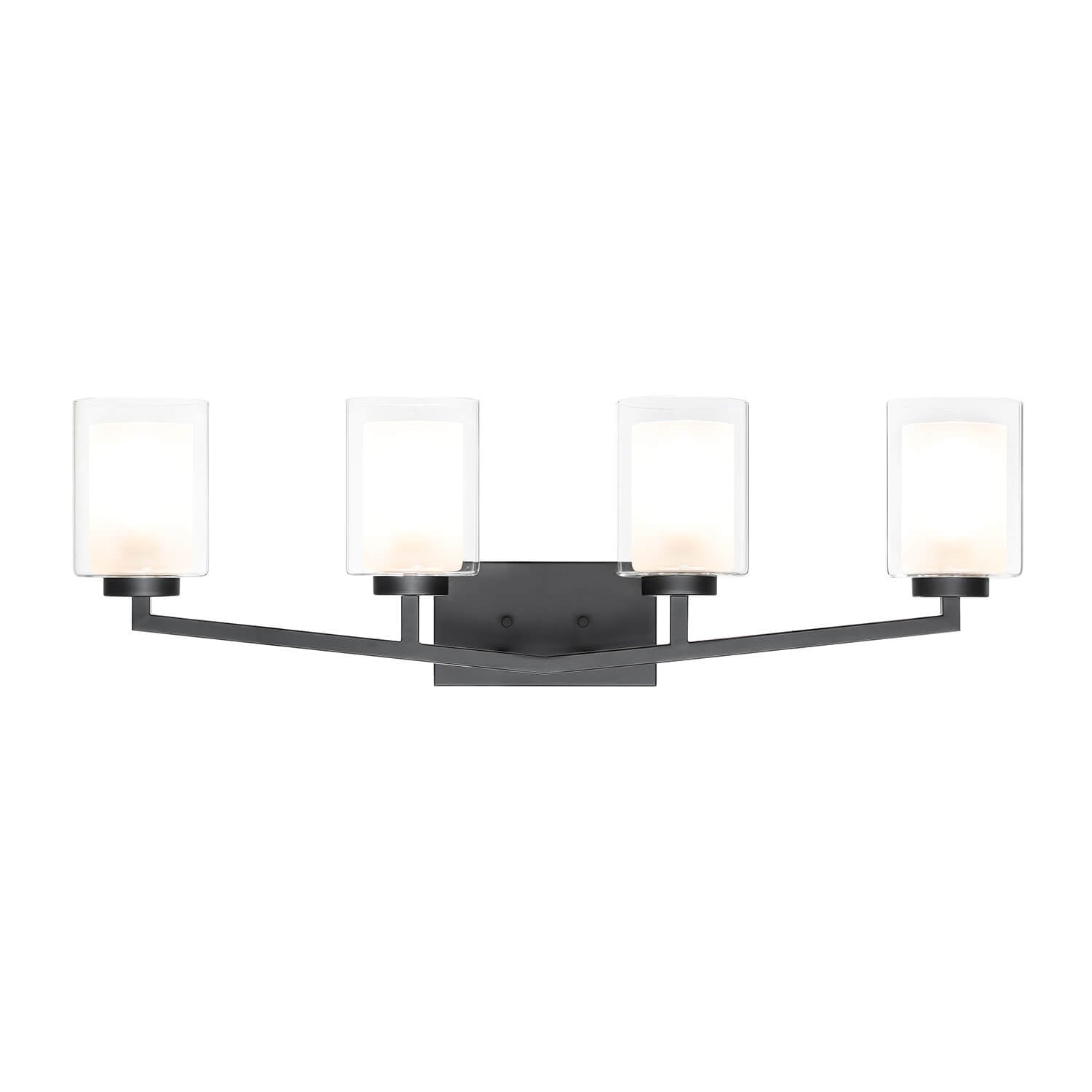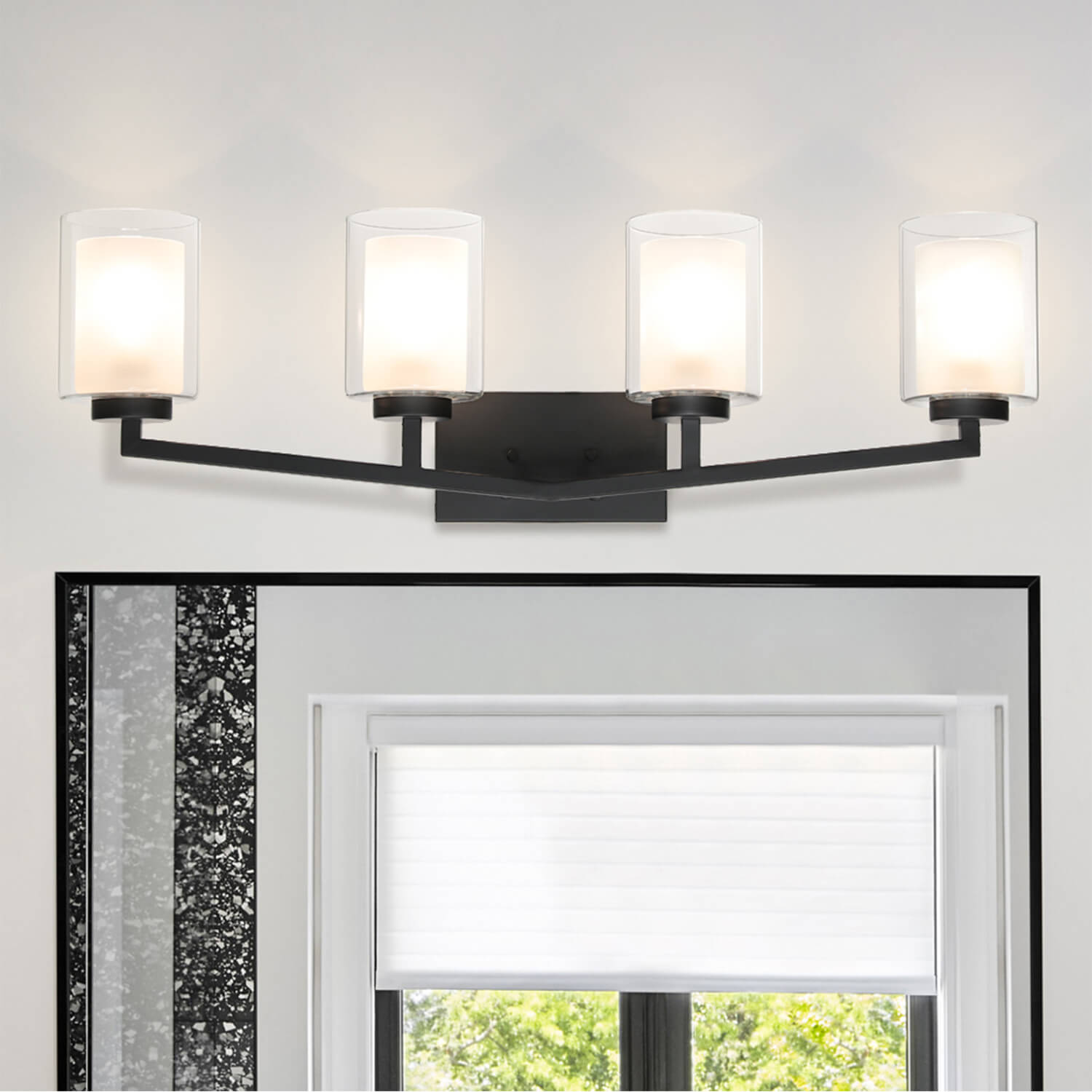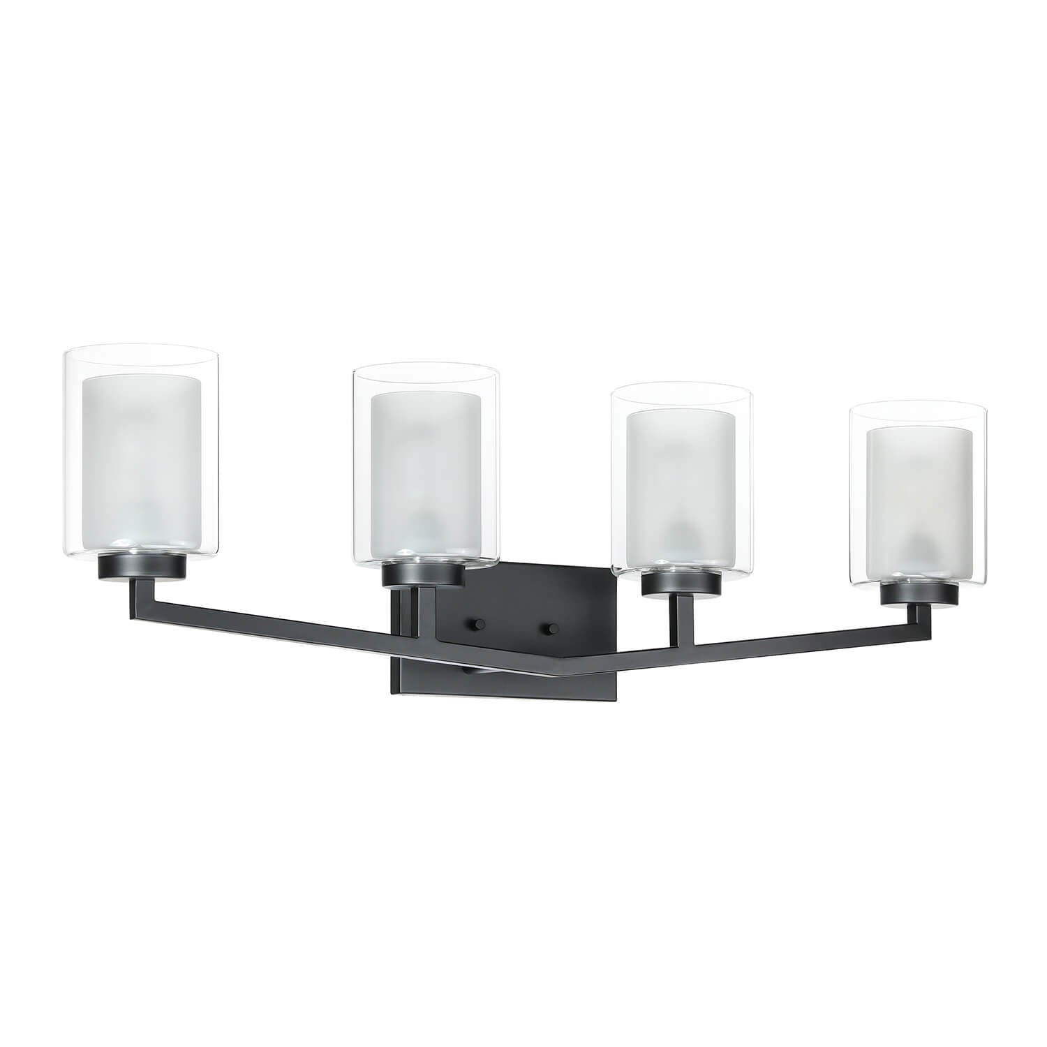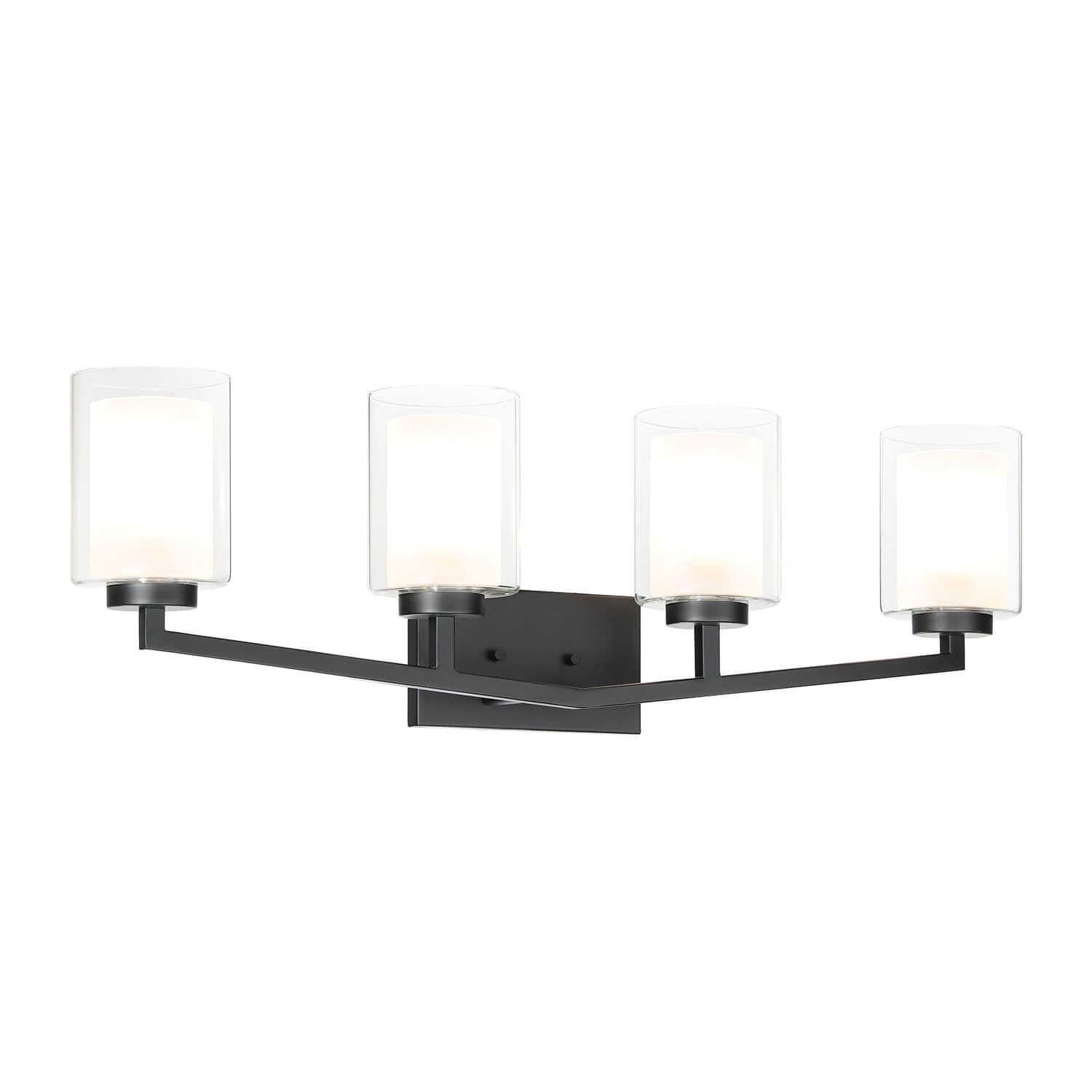 This vanity bath light light is with matte black clean lined hardware body and is combined with dual glass shades (cylinder clear outer glass and frosted inner glass), that gently diffuse light when the fixture is illuminated, adding an elegant touch and different taste to your home.