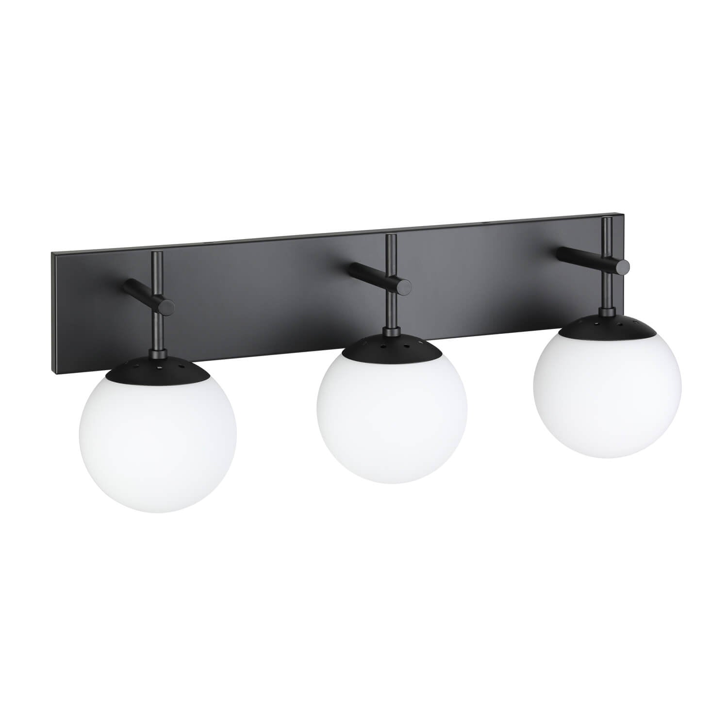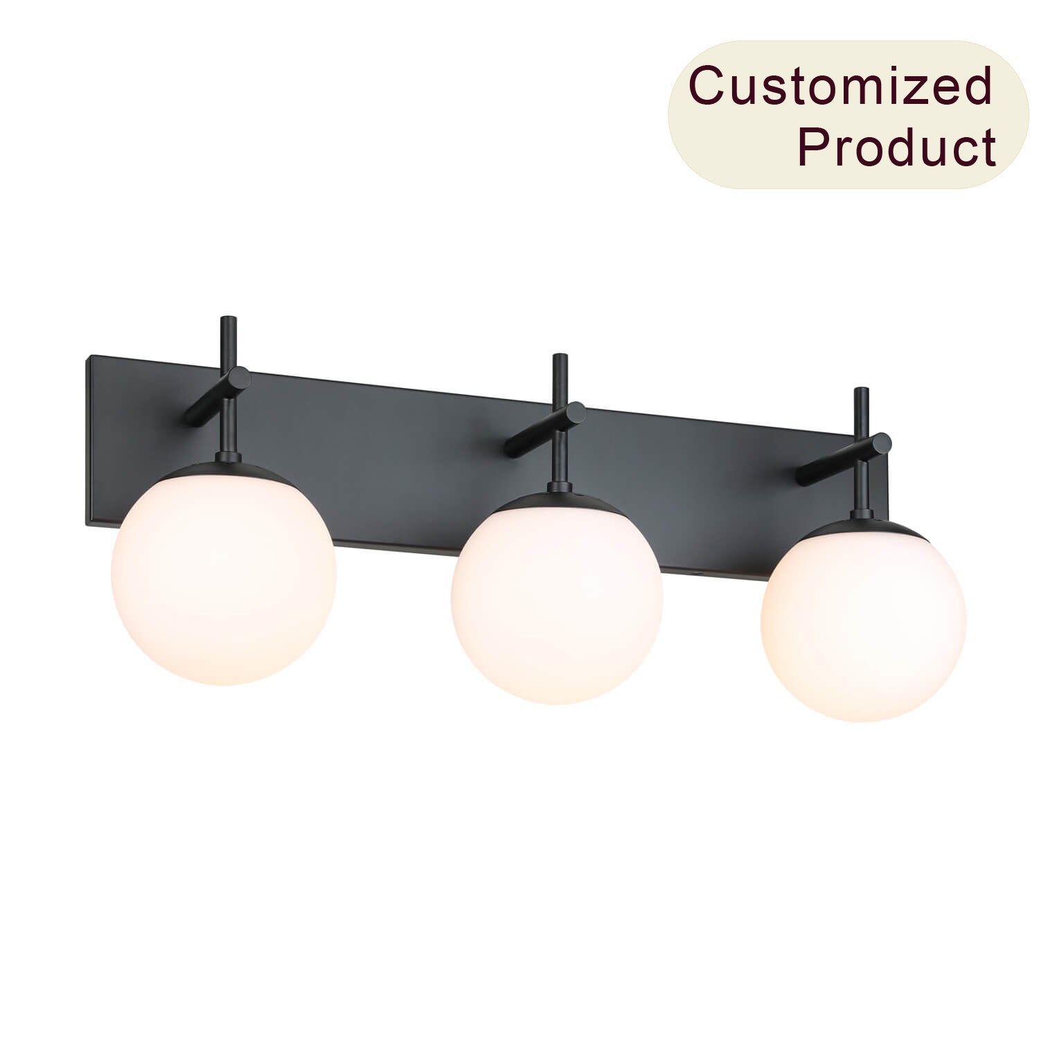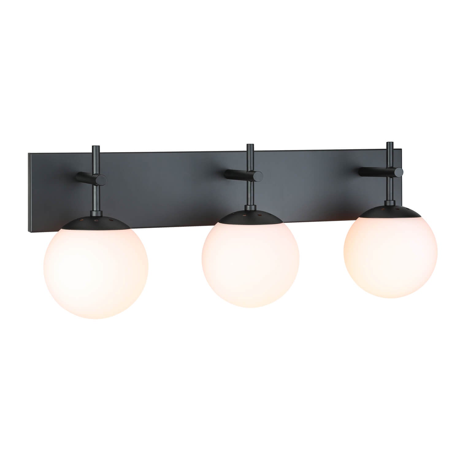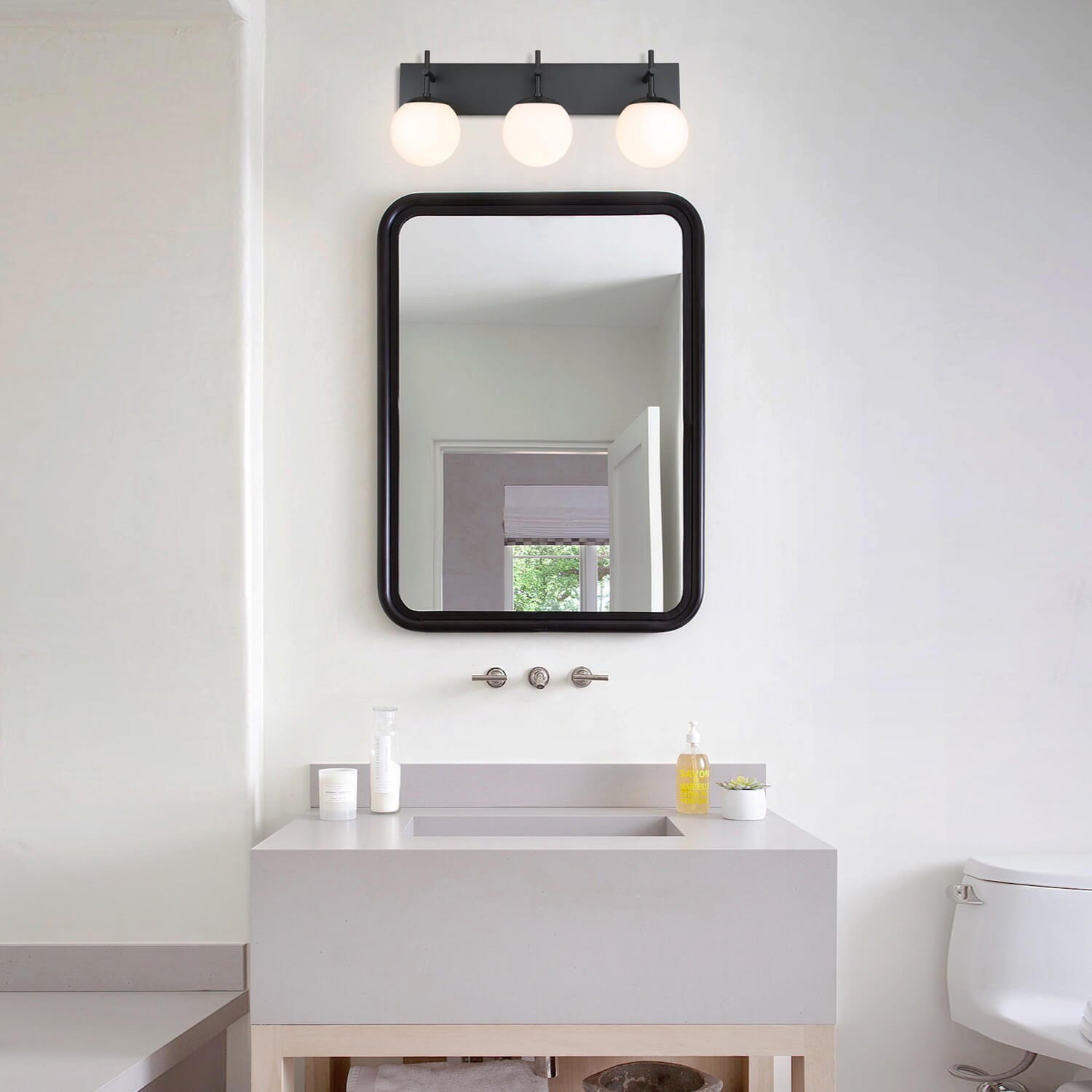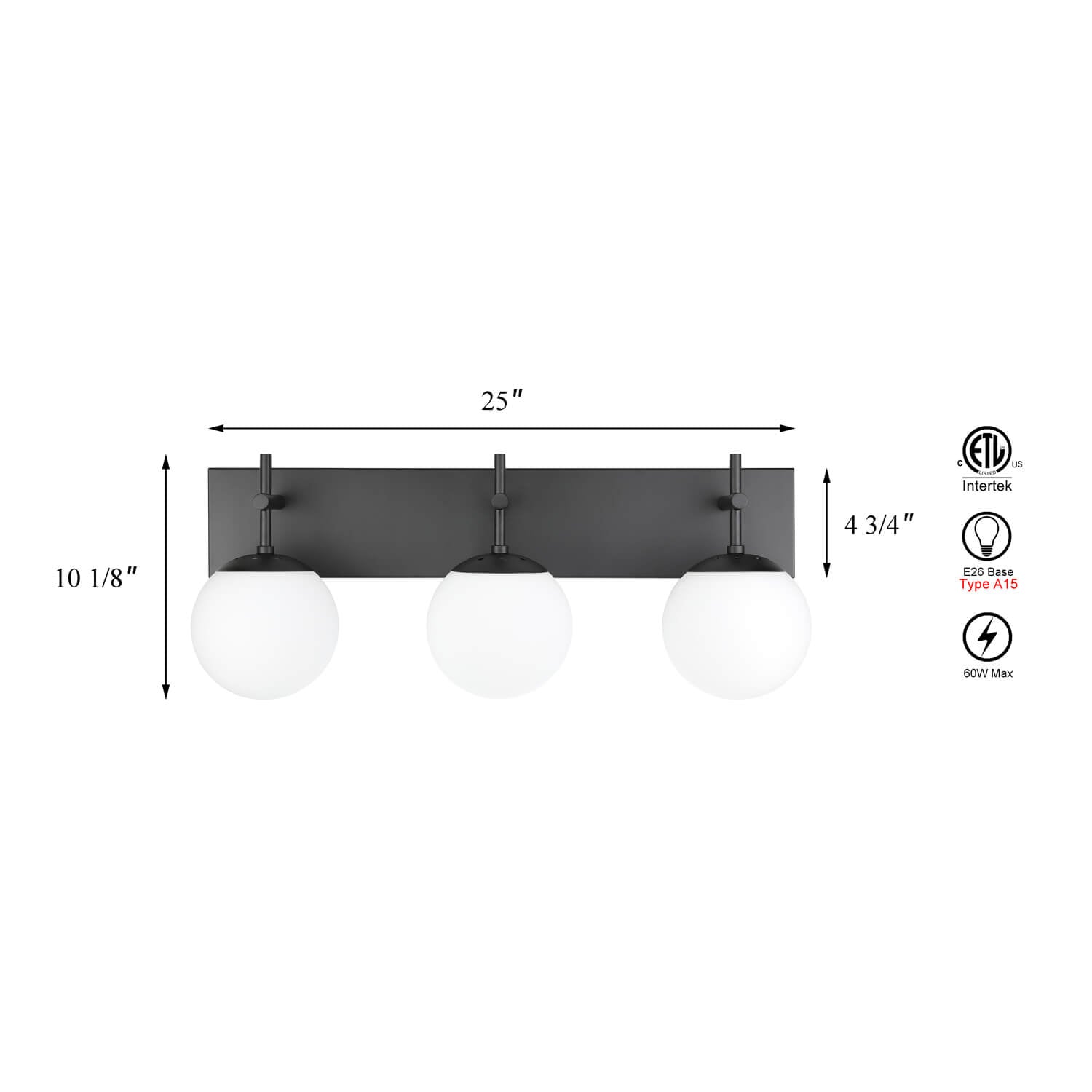 - TRANSITIONAL DESIGN: This globe vanity light enhance mid-century to modern furnishings on a note of luxury. The metal frame in a matte black finish extends into horizontal arms, with globe lights set below it. The combination of matte black lamp body and white globe glass for this 3 light bathroom vanity light creates a fashionable look as it casts a warm glow of light. This globe wall mount light fixture will create a stylish focal point and enhance the décor in your powder room, bathroom or spa.