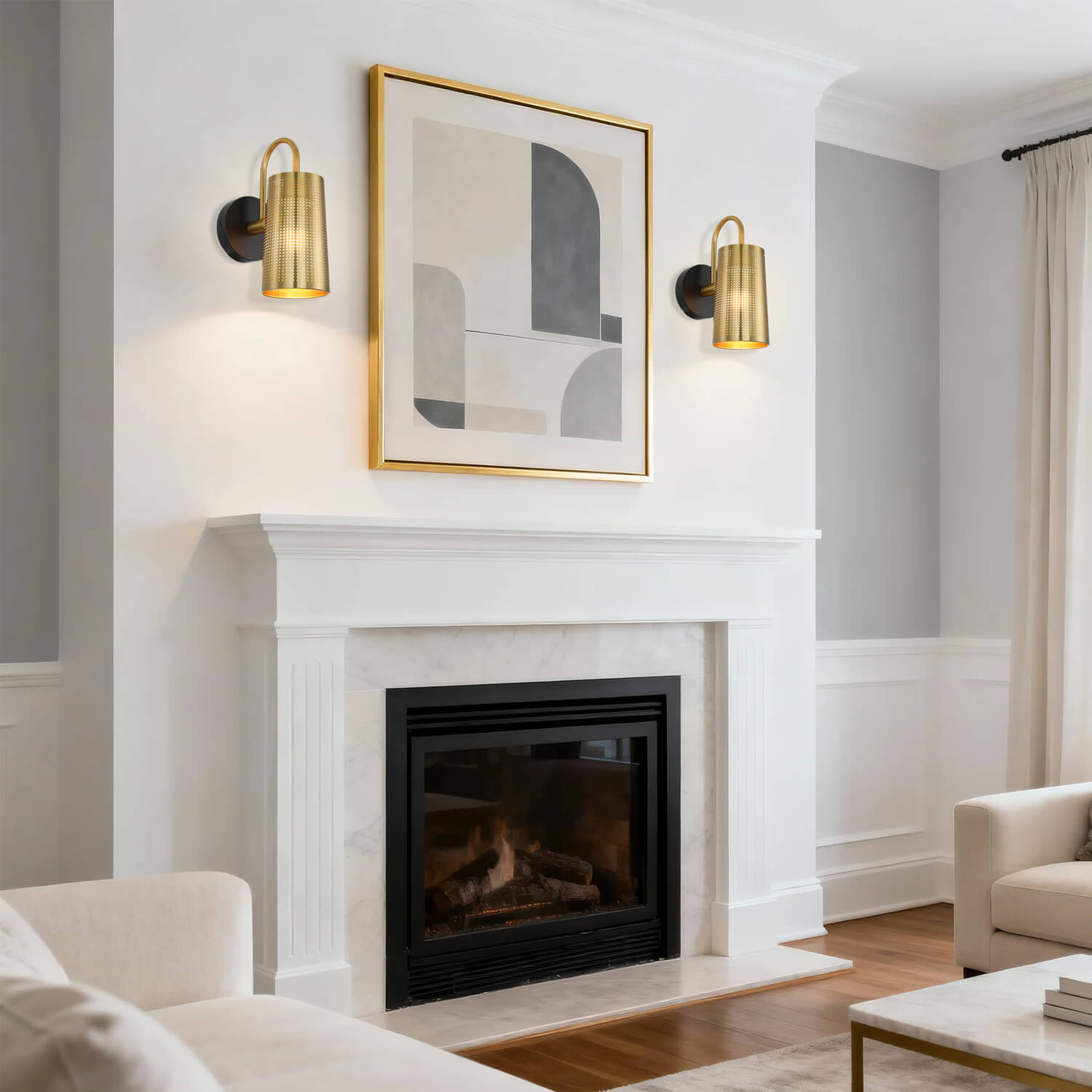 - MODERN DESIGNS: Wall sconce light features a striking combination of a matte black round backplate, a brushed brass tubular body, and a perforated iron cone shade. Its sleek silhouette and sophisticated finish make this wall lamp a perfect addition to corridors, entryways, bathrooms, kitchens, or living rooms—blending modern elegance with industrial charm to any interior space.