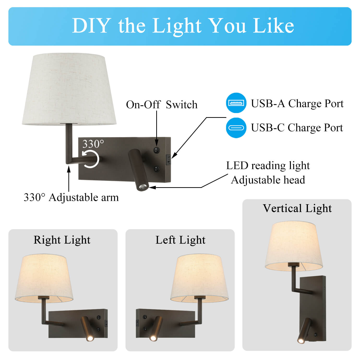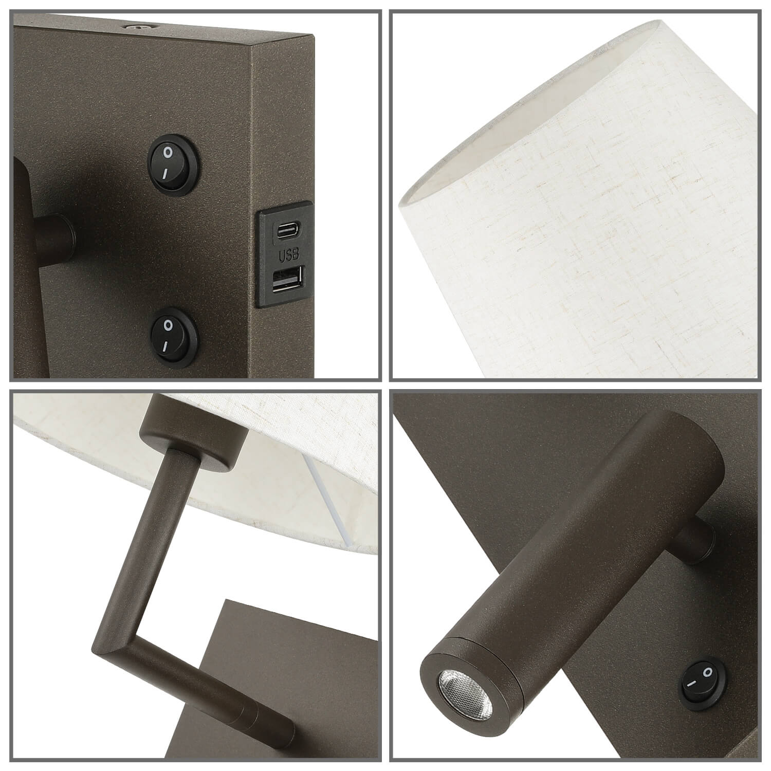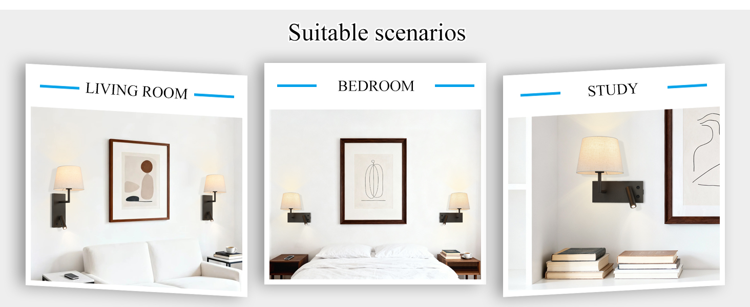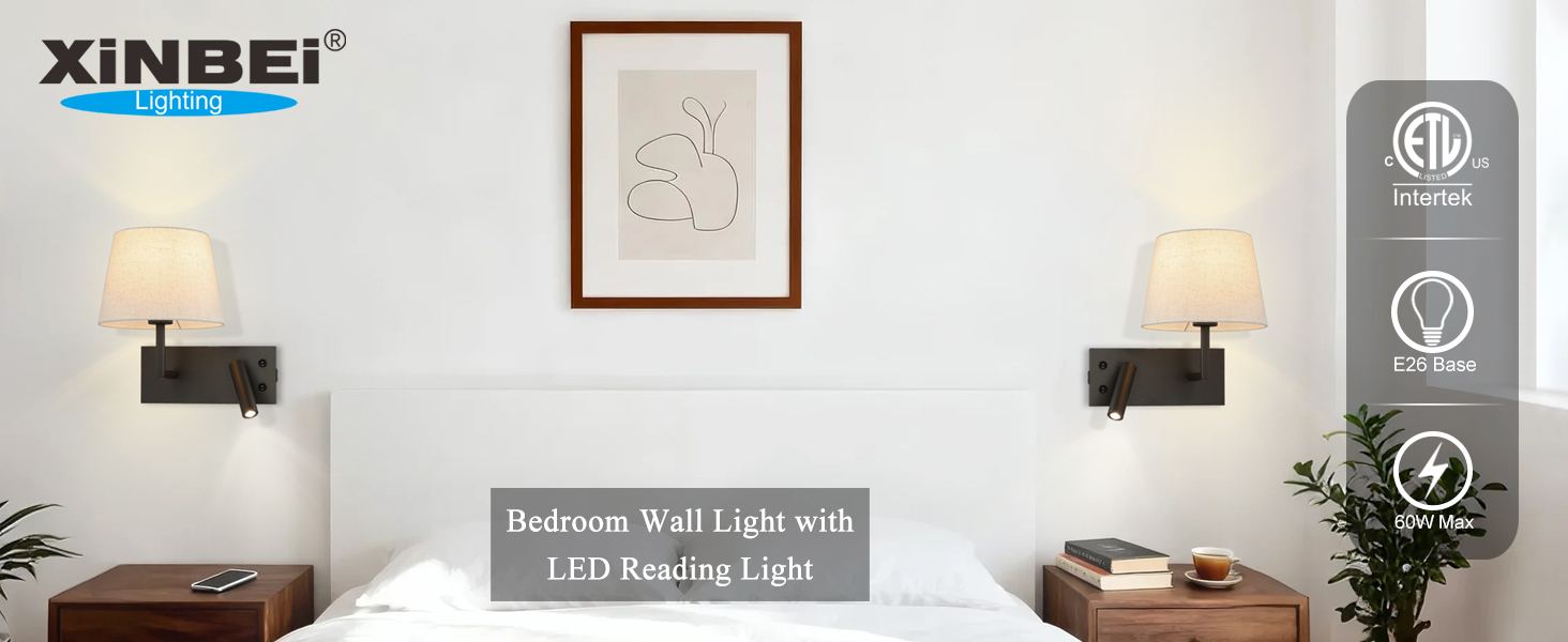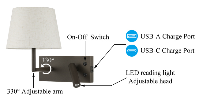 - FEATURE: Hardwire wall lamp features a rectangular backplate and a sleek dark bronze body with a beige fabric shade for a timeless, modern look—perfect for headboards, reading corners, hallways, and guest rooms. Bedside wall lights consists of fabric wall sconce and adjustable LED reading light that controlled by individual on/off rocker switch. Headboard wall mount lamp with Type A+C USB port for fast and convenient charging of phones, tablets, and other electronics.
