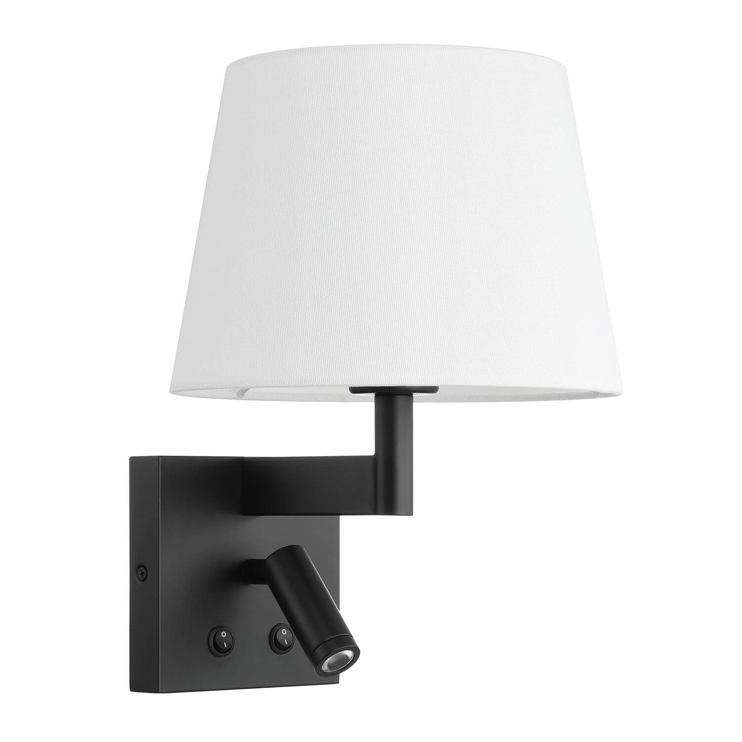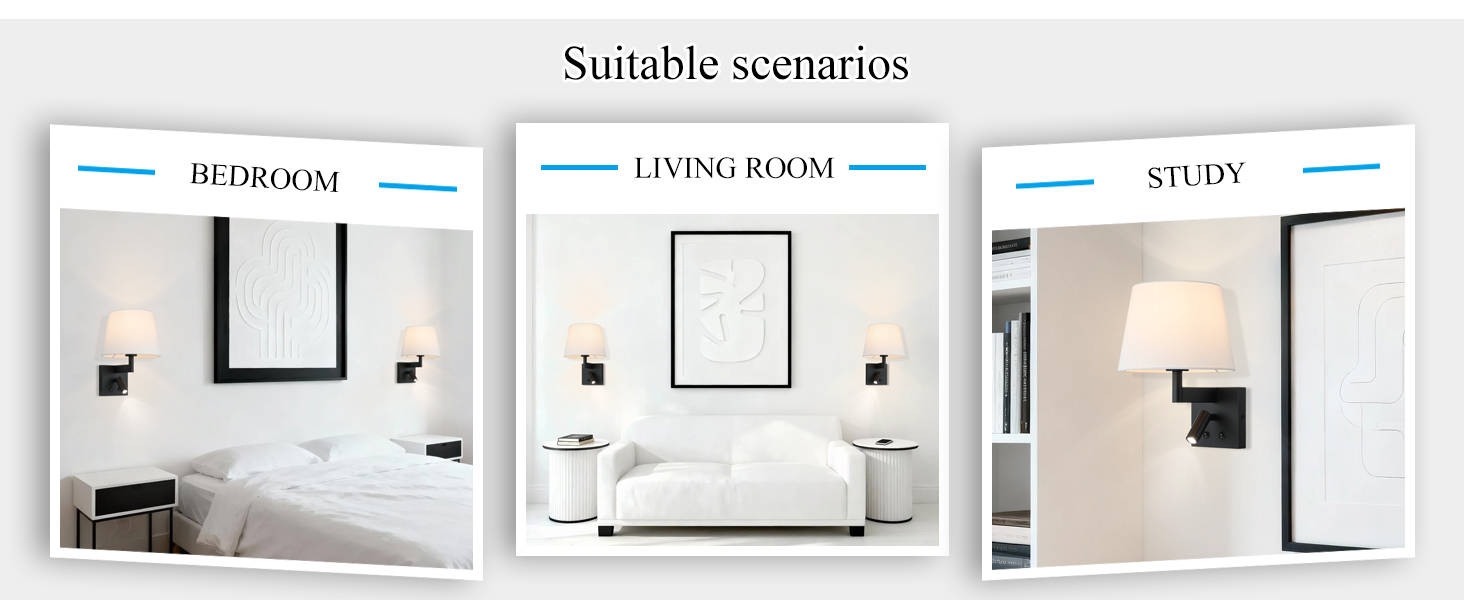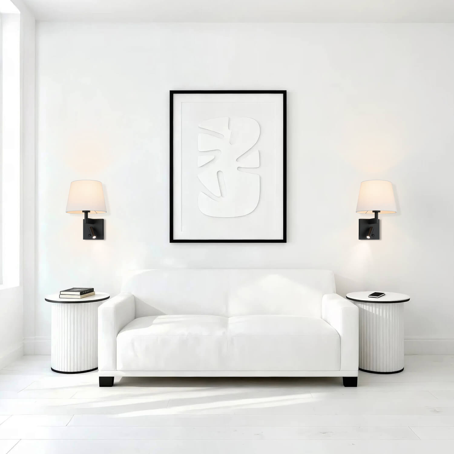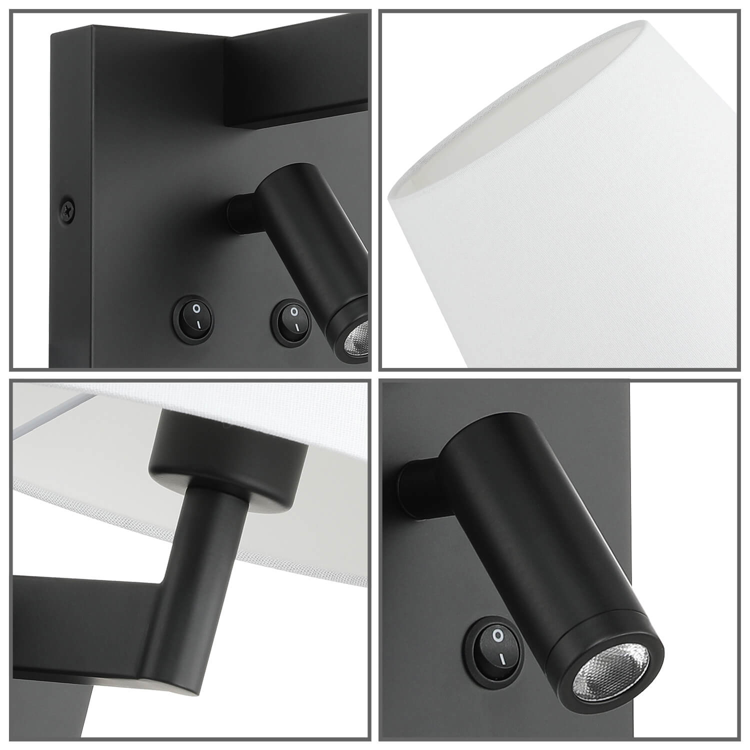 - FEATURE: Bedroom wall sconce features a sleek matte black body with a square backplate and a white fabric shade, blending seamlessly with bedroom or hotel decor. Wall lamp with fabric shade is the dual Light Fixture – Combines a soft fabric shade lamp for ambient lighting with an additional adjustable spotlight for reading or task lighting. Two rocker switches on the backplate allow independent operation of the fabric wall lamp and the LED spotlight.